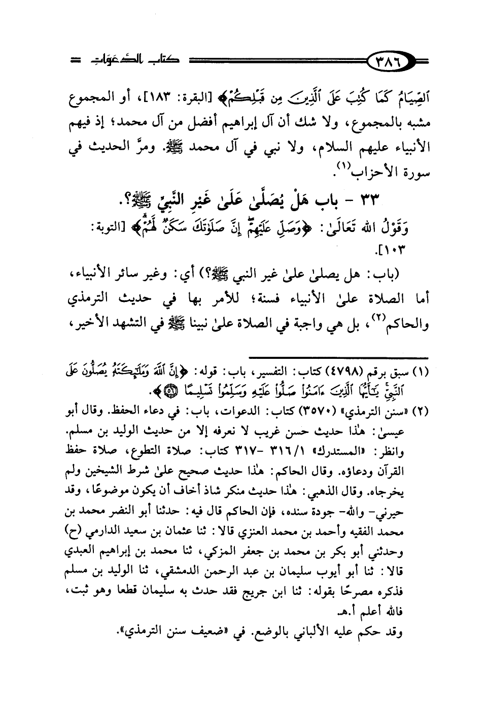33 - بَابُ هَلْ يُصَلَّى عَلَى غَيْرِ النَّبِيِّ صَلَّى اللهُ عَلَيْهِ وَسَلَّمَ؟.