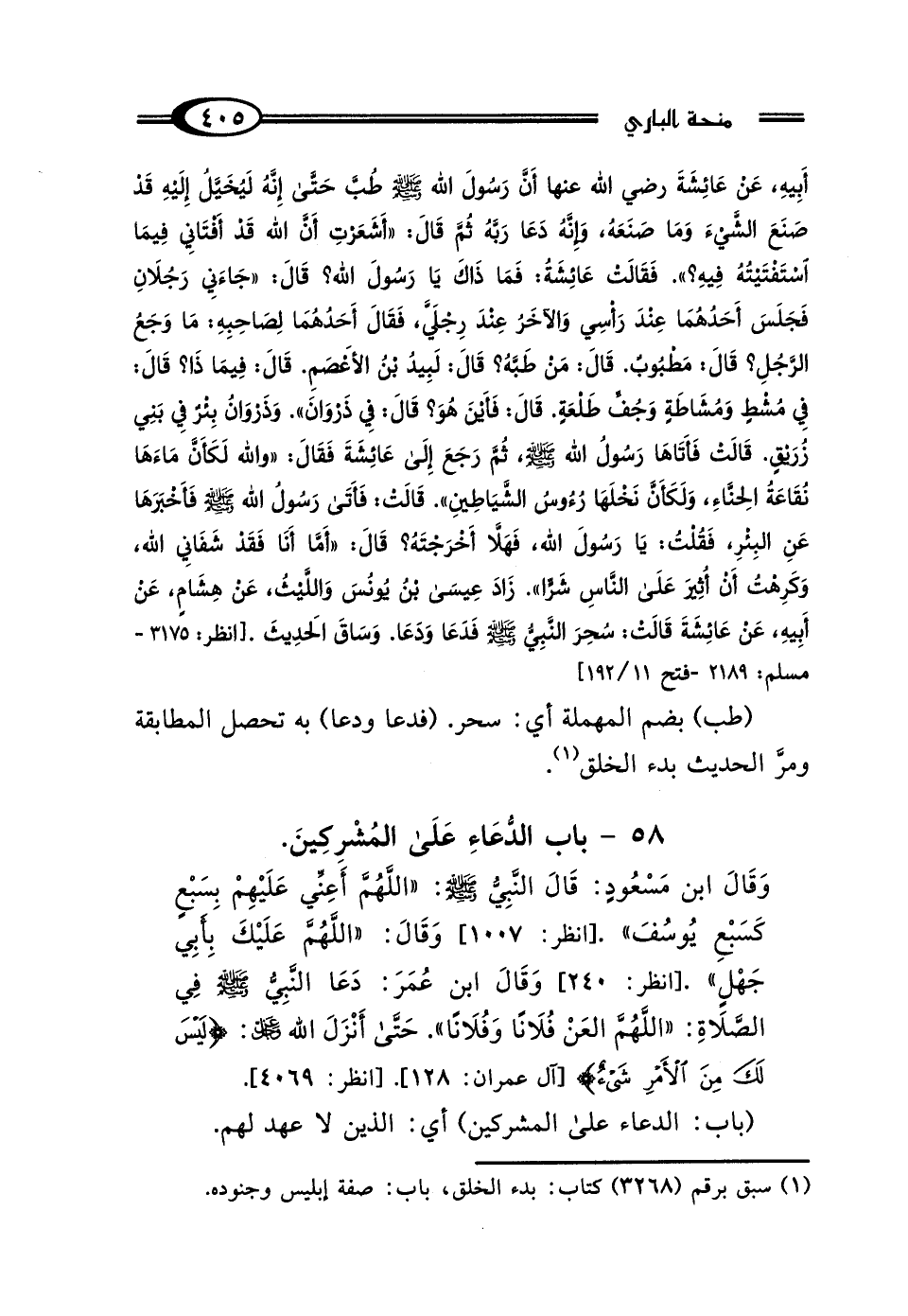 أَبِيهِ، عَنْ عَائِشَةَ رَضِيَ اللَّهُ عَنْهَا: أَنَّ رَسُولَ اللَّهِ صَلَّى اللهُ عَلَيْهِ وَسَلَّمَ طُبَّ، حَتَّى إِنَّهُ لَيُخَيَّلُ إِلَيْهِ أَنَّهُ قَدْ صَنَعَ الشَّيْءَ وَمَا صَنَعَهُ، وَإِنَّهُ دَعَا رَبَّهُ، ثُمَّ قَال: "أَشَعَرْتِ أَنَّ اللَّهَ قَدْ أَفْتَانِي فِيمَا اسْتَفْتَيْتُهُ فِيهِ" فَقَالتْ عَائِشَةُ: فَمَا ذَاكَ يَا رَسُولَ اللَّهِ؟ قَال: "جَاءَنِي رَجُلانِ، فَجَلَسَ أَحَدُهُمَا عِنْدَ رَأْسِي، وَالآخَرُ عِنْدَ رِجْلَيَّ، فَقَال أَحَدُهُمَا لِصَاحِبِهِ: مَا وَجَعُ الرَّجُلِ؟ قَال: مَطْبُوبٌ، قَال: مَنْ طَبَّهُ؟ قَال: لَبِيدُ بْنُ الأَعْصَمِ، قَال: فِي مَاذَا؟ قَال: فِي مُشْطٍ وَمُشَاطَةٍ وَجُفِّ طَلْعَةٍ، قَال: فَأَيْنَ هُوَ؟ قَال: فِي ذَرْوَانَ " - وَذَرْوَانُ بِئْرٌ فِي بَنِي زُرَيْقٍ - قَالتْ: فَأَتَاهَا رَسُولُ اللَّهِ صَلَّى اللهُ عَلَيْهِ وَسَلَّمَ ثُمَّ رَجَعَ إِلَى عَائِشَةَ، فَقَال: "وَاللَّهِ لَكَأَنَّ مَاءَهَا نُقَاعَةُ الحِنَّاءِ، وَلَكَأَنَّ نَخْلَهَا رُءُوسُ الشَّيَاطِينِ" قَالتْ: فَأَتَى رَسُولُ اللَّهِ صَلَّى اللهُ عَلَيْهِ وَسَلَّمَ فَأَخْبَرَهَا عَنِ البِئْرِ، فَقُلْتُ: يَا رَسُولَ اللَّهِ فَهَلَّا أَخْرَجْتَهُ؟ قَال: "أَمَّا أَنَا فَقَدْ شَفَانِي اللَّهُ، وَكَرِهْتُ أَنْ أُثِيرَ عَلَى النَّاسِ شَرًّا" زَادَ عِيسَى بْنُ يُونُسَ، وَاللَّيْثُ بْنُ سَعْدٍ، عَنْ هِشَامٍ، عَنْ أَبِيهِ، عَنْ عَائِشَةَ، قَالتْ: "سُحِرَ النَّبِيُّ صَلَّى اللهُ عَلَيْهِ وَسَلَّمَ، فَدَعَا وَدَعَا" وَسَاقَ الحَدِيثَ.