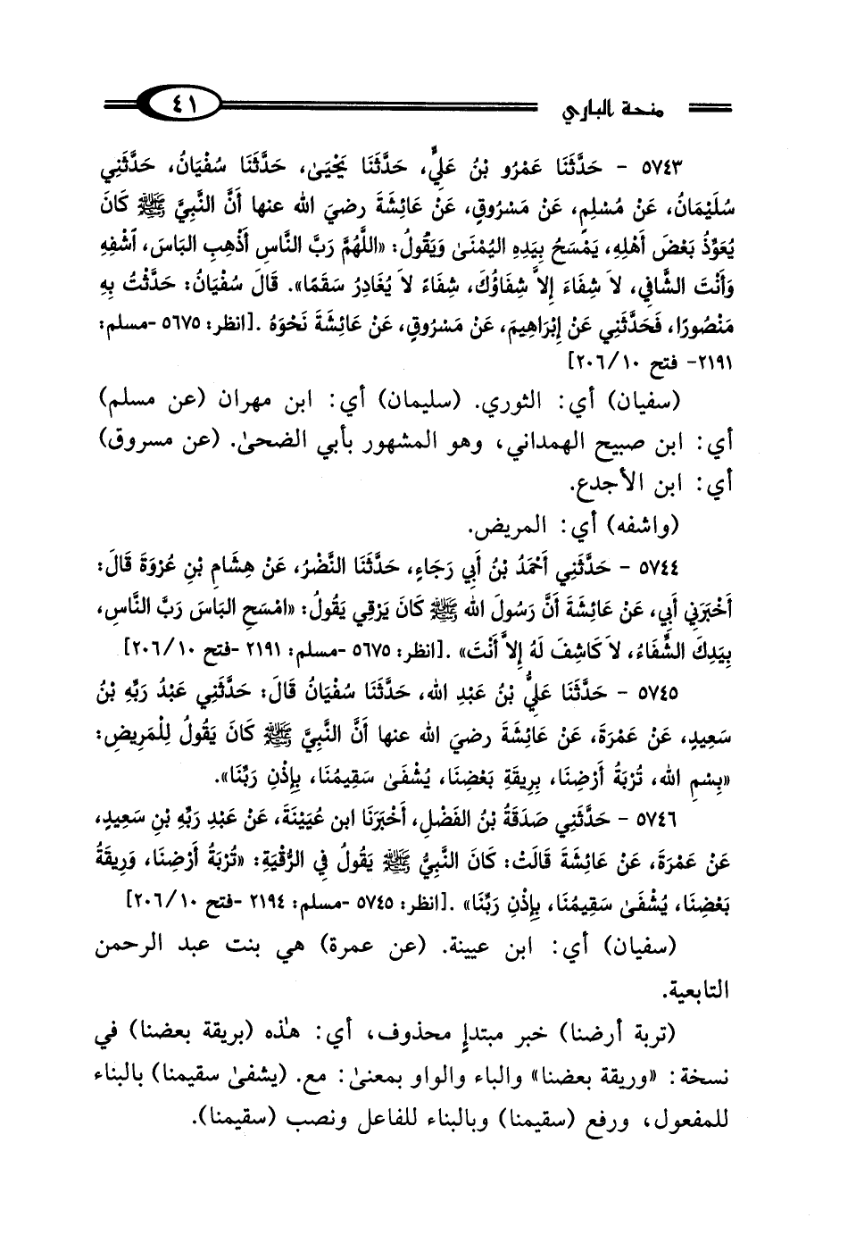 5745 - حَدَّثَنَا عَلِيُّ بْنُ عَبْدِ اللَّهِ، حَدَّثَنَا سُفْيَانُ، قَال: حَدَّثَنِي عَبْدُ رَبِّهِ بْنُ سَعِيدٍ، عَنْ عَمْرَةَ، عَنْ عَائِشَةَ، رَضِيَ اللَّهُ عَنْهَا: أَنَّ النَّبِيَّ صَلَّى اللهُ عَلَيْهِ وَسَلَّمَ كَانَ يَقُولُ لِلْمَرِيضِ: "بِسْمِ اللَّهِ، تُرْبَةُ أَرْضِنَا، بِرِيقَةِ بَعْضِنَا، يُشْفَى سَقِيمُنَا، بِإِذْنِ رَبِّنَا".