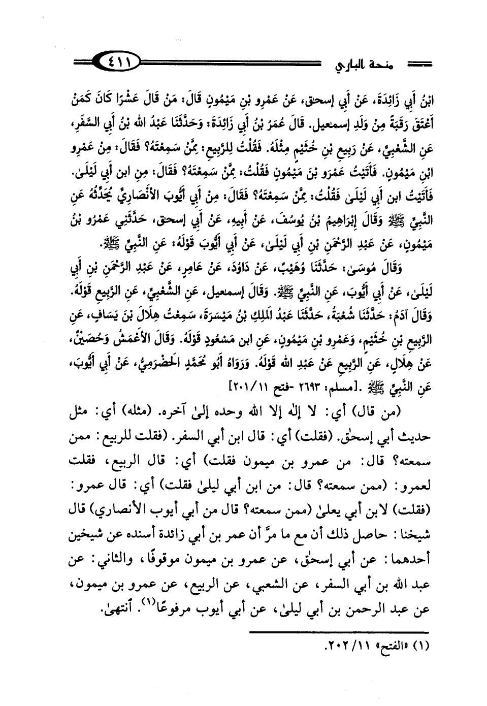 بْنُ أَبِي زَائِدَةَ، عَنْ أَبِي إِسْحَاقَ، عَنْ عَمْرِو بْنِ مَيْمُونٍ، قَال: "مَنْ قَال عَشْرًا، كَانَ كَمَنْ أَعْتَقَ رَقَبَةً مِنْ وَلَدِ إِسْمَاعِيلَ" قَال عُمَرُ بْنُ أَبِي زَائِدَةَ: وَحَدَّثَنَا عَبْدُ اللَّهِ بْنُ أَبِي السَّفَرِ، عَنِ الشَّعْبِيِّ، عَنْ رَبِيعِ بْنِ خُثَيْمٍ، مِثْلَهُ. فَقُلْتُ لِلرَّبِيعِ مِمَّنْ سَمِعْتَهُ؟ فَقَال: مِنْ عَمْرِو بْنِ مَيْمُونٍ، فَأَتَيْتُ عَمْرَو بْنَ مَيْمُونٍ، فَقُلْتُ: مِمَّنْ سَمِعْتَهُ؟ فَقَال: مِنَ ابْنِ أَبِي لَيْلَى، فَأَتَيْتُ ابْنَ أَبِي لَيْلَى، فَقُلْتُ: مِمَّنْ سَمِعْتَهُ؟ فَقَال: مِنْ أَبِي أَيُّوبَ الأَنْصَارِيِّ، يُحَدِّثَهُ عَنِ النَّبِيِّ صَلَّى اللهُ عَلَيْهِ وَسَلَّمَ، وَقَال إِبْرَاهِيمُ بْنُ يُوسُفَ: عَنْ أَبِيهِ، عَنْ أَبِي إِسْحَاقَ، حَدَّثَنِي عَمْرُو بْنُ مَيْمُونٍ، عَنْ عَبْدِ الرَّحْمَنِ بْنِ أَبِي لَيْلَى، عَنْ أَبِي أَيُّوبَ قَوْلَهُ عَنِ النَّبِيِّ صَلَّى اللهُ عَلَيْهِ وَسَلَّمَ، وَقَال مُوسَى، حَدَّثَنَا وُهَيْبٌ، عَنْ دَاوُدَ، عَنْ عَامِرٍ، عَنْ عَبْدِ الرَّحْمَنِ بْنِ أَبِي لَيْلَى، عَنْ أَبِي أَيُّوبَ، عَنِ النَّبِيِّ صَلَّى اللهُ عَلَيْهِ وَسَلَّمَ، وَقَال إِسْمَاعِيلُ، عَنِ الشَّعْبِيِّ، عَنِ الرَّبِيعِ، قَوْلَهُ. وَقَال آدَمُ: حَدَّثَنَا شُعْبَةُ، حَدَّثَنَا عَبْدُ المَلِكِ بْنُ مَيْسَرَةَ، سَمِعْتُ هِلال بْنَ يَسَافٍ، عَنِ الرَّبِيعِ بْنِ خُثَيْمٍ، وَعَمْرِو بْنِ مَيْمُونٍ، عَنْ ابْنِ مَسْعُودٍ، قَوْلَهُ. وَقَال الأَعْمَشُ، وَحُصَيْنٌ: عَنْ هِلالٍ، عَنِ الرَّبِيعِ، عَنْ عَبْدِ اللَّهِ، قَوْلَهُ. وَرَوَاهُ أَبُو مُحَمَّدٍ الحَضْرَمِيُّ، عَنْ أَبِي أَيُّوبَ، عَنِ النَّبِيِّ صَلَّى اللهُ عَلَيْهِ وَسَلَّمَ: "كَانَ كَمَنْ أَعْتَقَ رَقَبَةً مِنْ وَلَدِ إِسْمَاعِيلَ" قَال أَبُو عَبْدِ اللَّهِ: "وَالصَّحِيحُ قَوْلُ عَبْدِ المَلِكِ بْنِ عَمْرٍو".
