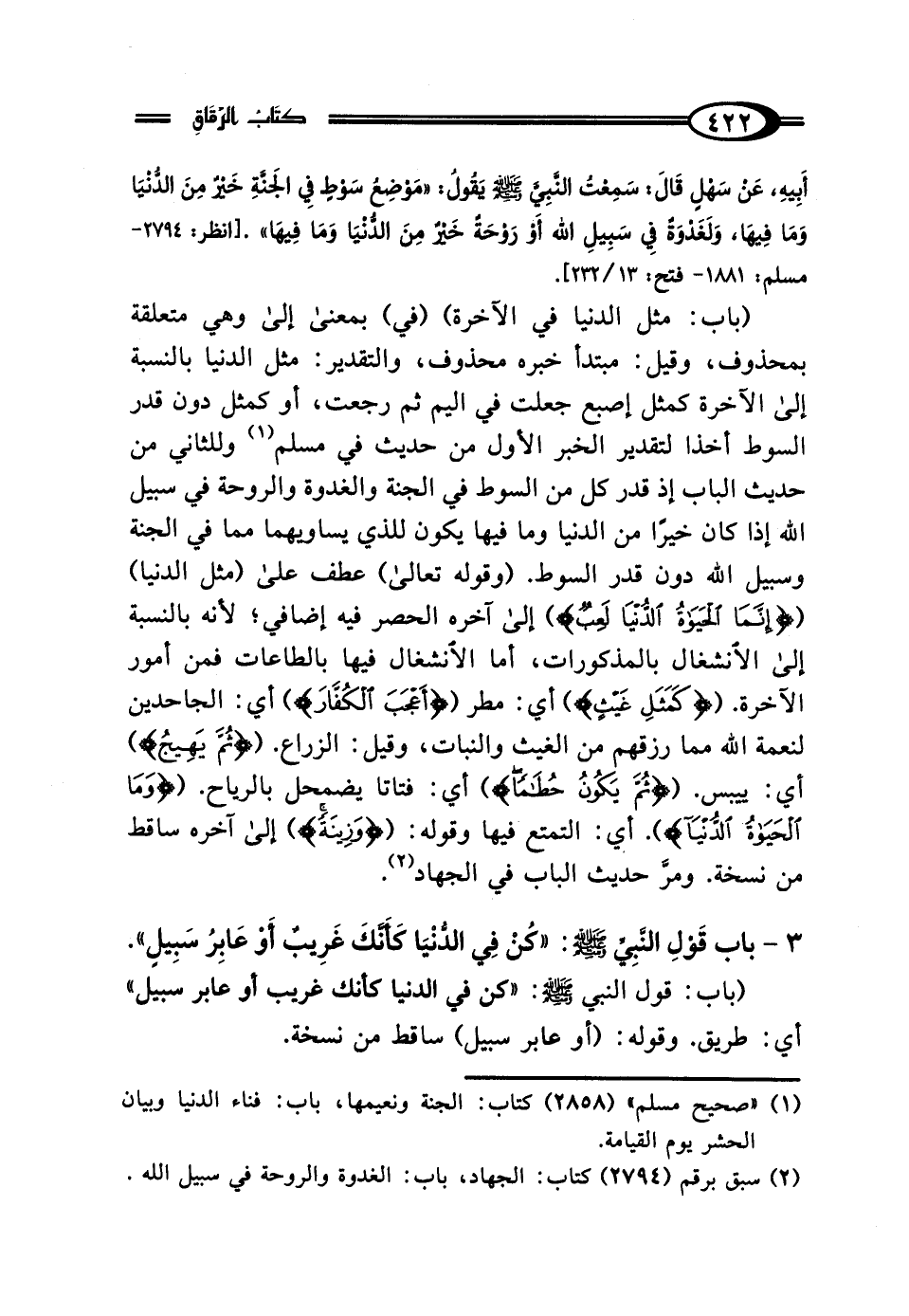 3 - بَابُ قَوْلِ النَّبِيِّ صَلَّى اللهُ عَلَيْهِ وَسَلَّمَ: "كُنْ فِي الدُّنْيَا كَأَنَّكَ غَرِيبٌ أَوْ عَابِرُ سَبِيلٍ"