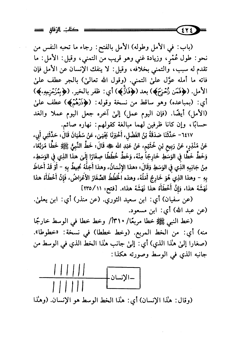 6417 - حَدَّثَنَا صَدَقَةُ بْنُ الفَضْلِ، أَخْبَرَنَا يَحْيَى بْنُ سَعِيدٍ، عَنْ سُفْيَانَ، قَال: حَدَّثَنِي أَبِي، عَنْ مُنْذِرٍ، عَنْ رَبِيعِ بْنِ خُثَيْمٍ، عَنْ عَبْدِ اللَّهِ رَضِيَ اللَّهُ عَنْهُ، قَال: خَطَّ النَّبِيُّ صَلَّى اللهُ عَلَيْهِ وَسَلَّمَ خَطًّا مُرَبَّعًا، وَخَطَّ خَطًّا فِي الوَسَطِ خَارِجًا مِنْهُ، وَخَطَّ خُطَطًا صِغَارًا إِلَى هَذَا الَّذِي فِي الوَسَطِ مِنْ جَانِبِهِ الَّذِي فِي الوَسَطِ، وَقَال: "هَذَا الإِنْسَانُ، وَهَذَا أَجَلُهُ مُحِيطٌ بِهِ - أَوْ: قَدْ أَحَاطَ بِهِ - وَهَذَا الَّذِي هُوَ خَارِجٌ أَمَلُهُ، وَهَذِهِ الخُطَطُ الصِّغَارُ الأَعْرَاضُ، فَإِنْ أَخْطَأَهُ هَذَا نَهَشَهُ هَذَا، وَإِنْ أَخْطَأَهُ هَذَا نَهَشَهُ هَذَا".