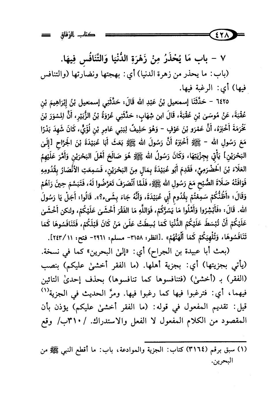 6425 - حَدَّثَنَا إِسْمَاعِيلُ بْنُ عَبْدِ اللَّهِ، قَال: حَدَّثَنِي إِسْمَاعِيلُ بْنُ إِبْرَاهِيمَ بْنِ عُقْبَةَ، عَنْ مُوسَى بْنِ عُقْبَةَ، قَال ابْنُ شِهَابٍ: حَدَّثَنِي عُرْوَةُ بْنُ الزُّبَيْرِ، أَنَّ المِسْوَرَ بْنَ مَخْرَمَةَ، أَخْبَرَهُ: أَنَّ عَمْرَو بْنَ عَوْفٍ، وَهُوَ حَلِيفٌ لِبَنِي عَامِرِ بْنِ لُؤَيٍّ، كَانَ شَهِدَ بَدْرًا مَعَ رَسُولِ اللَّهِ صَلَّى اللهُ عَلَيْهِ وَسَلَّمَ، أَخْبَرَهُ: أَنَّ رَسُولَ اللَّهِ صَلَّى اللهُ عَلَيْهِ وَسَلَّمَ بَعَثَ أَبَا عُبَيْدَةَ بْنَ الجَرَّاحِ [إِلَى البَحْرَيْنِ] يَأْتِي بِجِزْيَتِهَا، وَكَانَ رَسُولُ اللَّهِ صَلَّى اللهُ عَلَيْهِ وَسَلَّمَ هُوَ صَالحَ أَهْلَ البَحْرَيْنِ، وَأَمَّرَ عَلَيْهِمُ العَلاءَ بْنَ الحَضْرَمِيِّ، فَقَدِمَ أَبُو عُبَيْدَةَ بِمَالٍ مِنَ البَحْرَيْنِ، فَسَمِعَتِ الأَنْصَارُ بِقُدُومِهِ، فَوَافَتْهُ صَلاةَ الصُّبْحِ مَعَ رَسُولِ اللَّهِ صَلَّى اللهُ عَلَيْهِ وَسَلَّمَ، فَلَمَّا انْصَرَفَ تَعَرَّضُوا لَهُ، فَتَبَسَّمَ رَسُولُ اللَّهِ صَلَّى اللهُ عَلَيْهِ وَسَلَّمَ حِينَ رَآهُمْ، وَقَال: "أَظُنُّكُمْ سَمِعْتُمْ بِقُدُومِ أَبِي عُبَيْدَةَ، وَأَنَّهُ جَاءَ بِشَيْءٍ" قَالُوا: أَجَلْ يَا رَسُولَ اللَّهِ، قَال: "فَأَبْشِرُوا وَأَمِّلُوا مَا يَسُرُّكُمْ، فَوَاللَّهِ مَا الفَقْرَ أَخْشَى عَلَيْكُمْ، وَلَكِنْ أَخْشَى عَلَيْكُمْ أَنْ تُبْسَطَ عَلَيْكُمُ الدُّنْيَا، كَمَا بُسِطَتْ عَلَى مَنْ كَانَ قَبْلَكُمْ، فَتَنَافَسُوهَا كَمَا تَنَافَسُوهَا، وَتُلْهِيَكُمْ كَمَا أَلْهَتْهُمْ".