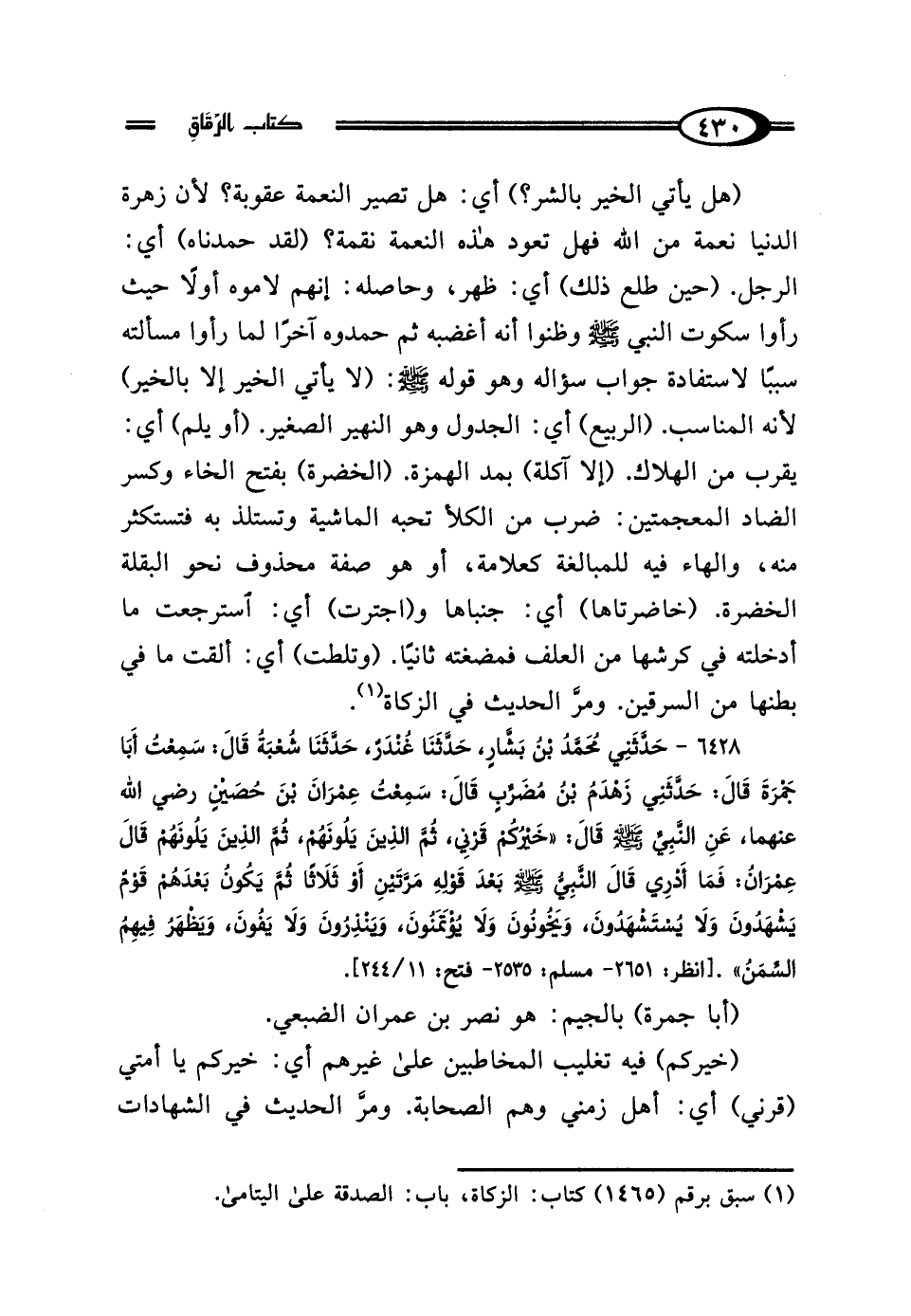 (هل يأتي الخير بالشر؟) أي: هل تصير النعمة عقوبة؟ لأن زهرة الدنيا نعمة من اللَّه فهل تعود هذه النعمة نقمة؟ (لقد حمدناه) أي: الرجل. (حين طلع ذلك) أي: ظهر، وحاصله: إنهم لاموه أولًا حيث رأوا سكوت النبي - صلى اللَّه عليه وسلم - وظنوا أنه أغضبه ثم حمدوه آخرًا لما رأوا مسألته سببًا لاستفادة جواب سؤاله وهو قوله - صلى اللَّه عليه وسلم -: (لا يأتي الخير إلا بالخير) لأنه المناسب. (الربيع) أي: الجدول وهو النهير الصغير. (أو يلم) أي: يقرب من الهلاك. (إلا آكلة) بمد الهمزة. (الخضرة) بفتح الخاء وكسر الضاد المعجمتين: ضرب من الكلأ تحبه الماشية وتستلذ به فتستكثر منه، والهاء فيه للمبالغة كعلامة، أو هو صفة محذوف نحو البقلة الخضرة. (خاضرتاها) أي: جنباها و (اجترت) أي: استرجعت ما أدخلته في كرشها من العلف فمضغته ثانيًا. (وتلطت) أي: ألقت ما في بطنها من السرقين. ومرَّ الحديث في الزكاة (¬1).
