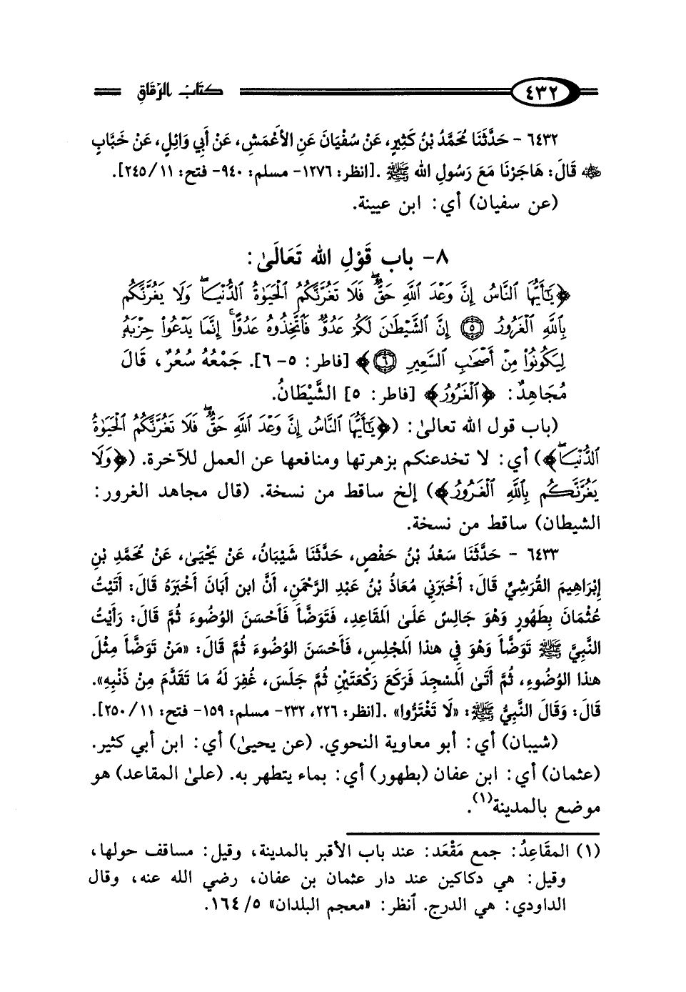 6433 - حَدَّثَنَا سَعْدُ بْنُ حَفْصٍ، حَدَّثَنَا شَيْبَانُ، عَنْ يَحْيَى، عَنْ مُحَمَّدِ بْنِ إِبْرَاهِيمَ القُرَشِيِّ، قَال: أَخْبَرَنِي مُعَاذُ بْنُ عَبْدِ الرَّحْمَنِ، أَنَّ حُمْرَانَ بْنَ أَبَانَ، أَخْبَرَهُ قَال: أَتَيْتُ عُثْمَانَ بْنَ عَفَّانَ، بِطَهُورٍ وَهُوَ جَالِسٌ عَلَى المَقَاعِدِ، فَتَوَضَّأَ فَأَحْسَنَ الوُضُوءَ، ثُمَّ قَال: رَأَيْتُ النَّبِيَّ صَلَّى اللهُ عَلَيْهِ وَسَلَّمَ تَوَضَّأَ وَهُوَ فِي هَذَا المَجْلِسِ، فَأَحْسَنَ الوُضُوءَ ثُمَّ قَال: "مَنْ تَوَضَّأَ مِثْلَ هَذَا الوُضُوءِ، ثُمَّ أَتَى المَسْجِدَ فَرَكَعَ رَكْعَتَيْنِ، ثُمَّ جَلَسَ، غُفِرَ لَهُ مَا تَقَدَّمَ مِنْ ذَنْبِهِ" قَال: وَقَال النَّبِيُّ صَلَّى اللهُ عَلَيْهِ وَسَلَّمَ: "لَا تَغْتَرُّوا".