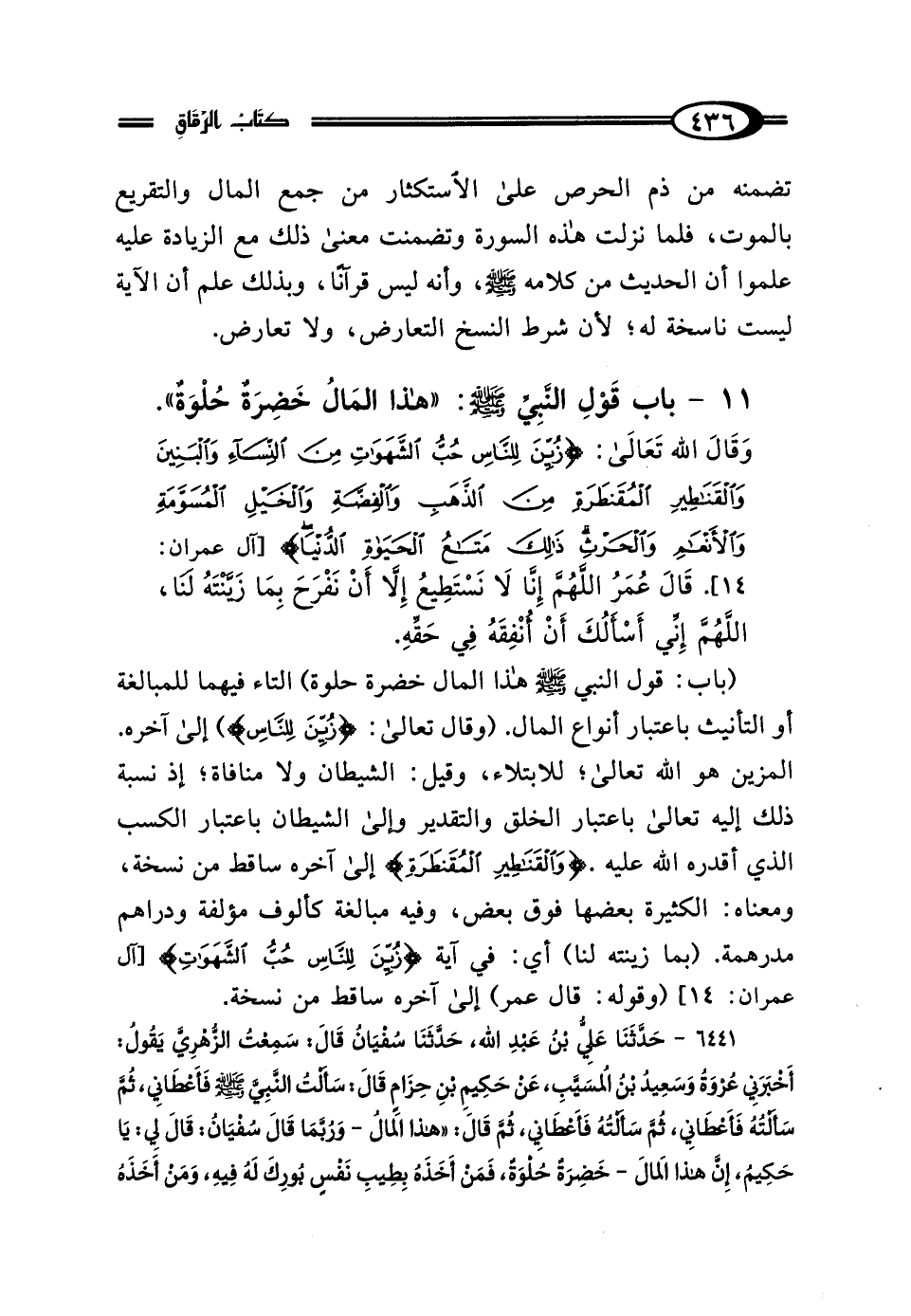 (باب: قول النبي - صلى اللَّه عليه وسلم - هذا المال خضرة حلوة) التاء فيهما للمبالغة أو التأنيث باعتبار أنواع المال. (وقال تعالى: {زُيِّنَ لِلنَّاسِ}) إلى آخره. المزين هو اللَّه تعالى؛ للابتلاء، وقيل: الشيطان ولا منافاة؛ إذ نسبة ذلك إليه تعالى باعتبار الخلق والتقدير وإلى الشيطان باعتبار الكسب الذي أقدره اللَّه عليه. {وَالْقَنَاطِيرِ الْمُقَنْطَرَةِ} إلى آخره ساقط من نسخة، ومعناه: الكثيرة بعضها فوق بعض، وفيه مبالغة كألوف مؤلفة ودراهم مدرهمة. (بما زينته لنا) أي: في آية {زُيِّنَ لِلنَّاسِ حُبُّ الشَّهَوَاتِ} [آل عمران: 14] (وقوله: قال عمر) إلى آخره ساقط من نسخة.