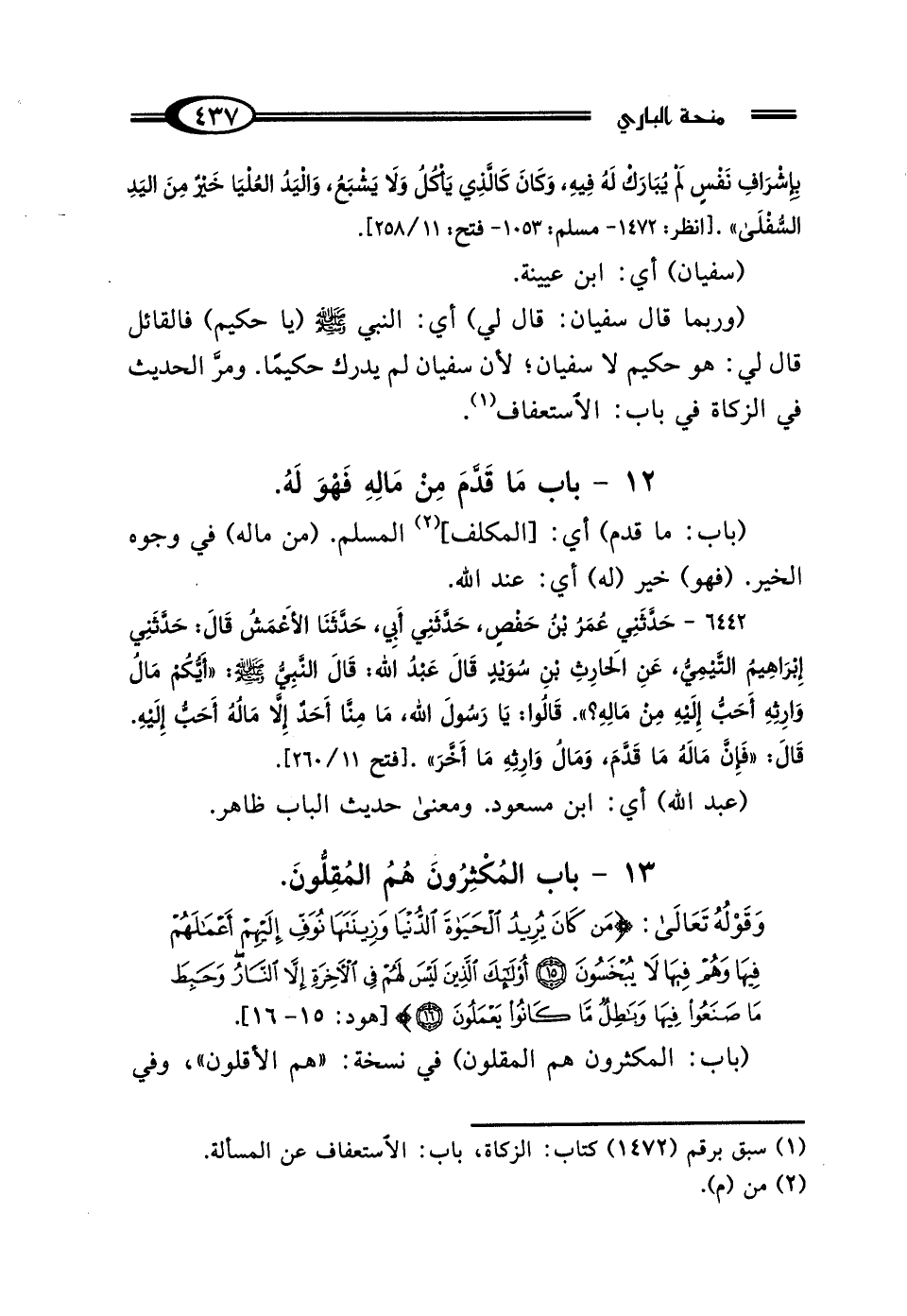 بِإِشْرَافِ نَفْسٍ لَمْ يُبَارَكْ لَهُ فِيهِ، وَكَانَ كَالَّذِي يَأْكُلُ وَلَا يَشْبَعُ، وَاليَدُ العُلْيَا خَيْرٌ مِنَ اليَدِ السُّفْلَى".