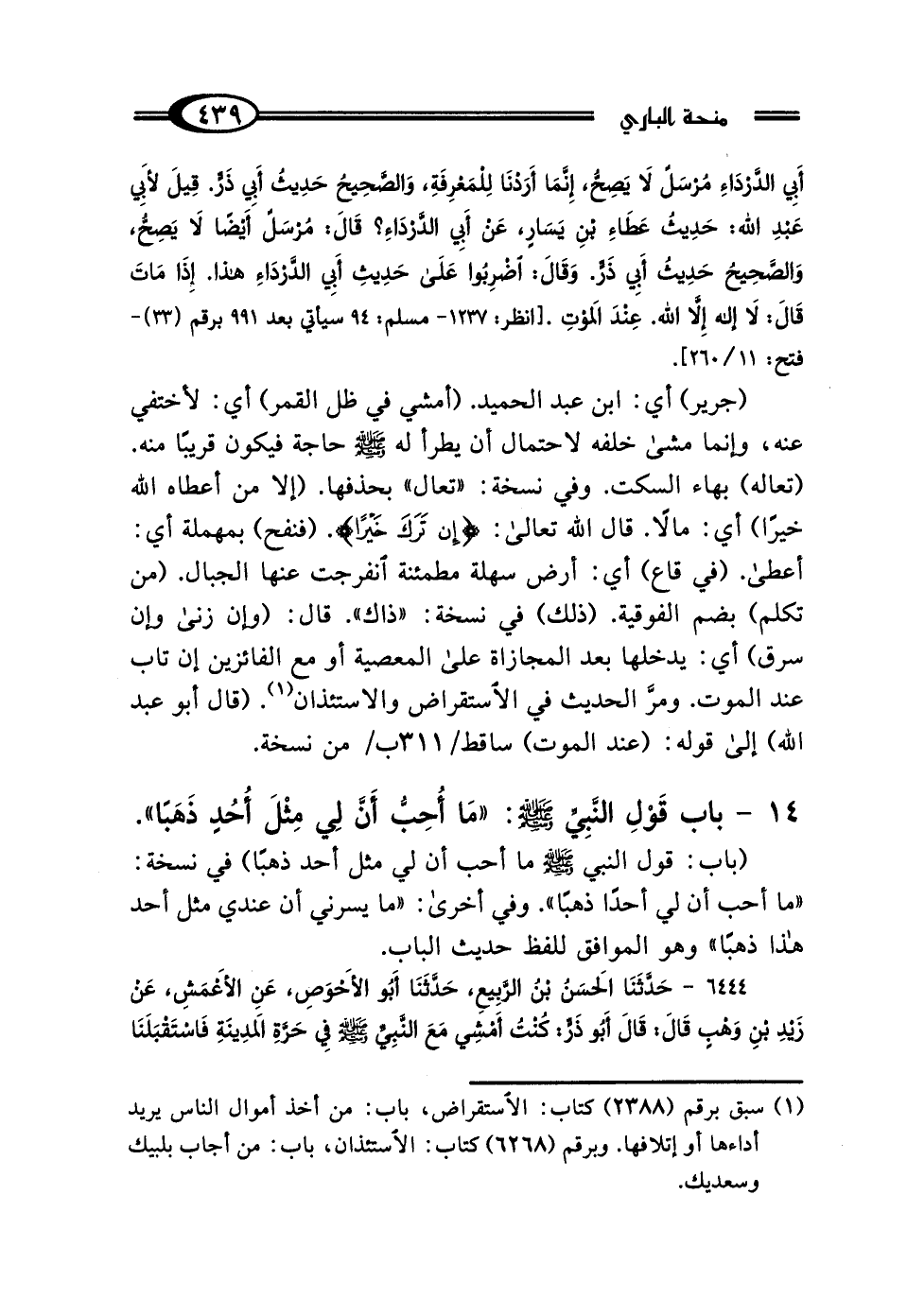 6444 - حَدَّثَنَا الحَسَنُ بْنُ الرَّبِيعِ، حَدَّثَنَا أَبُو الأَحْوَصِ، عَنِ الأَعْمَشِ، عَنْ زَيْدِ بْنِ وَهْبٍ، قَالَ: قَالَ أَبُو ذَرٍّ: كُنْتُ أَمْشِي مَعَ النَّبِيِّ صَلَّى اللهُ عَلَيْهِ وَسَلَّمَ فِي حَرَّةِ المَدِينَةِ، فَاسْتَقْبَلَنَا
