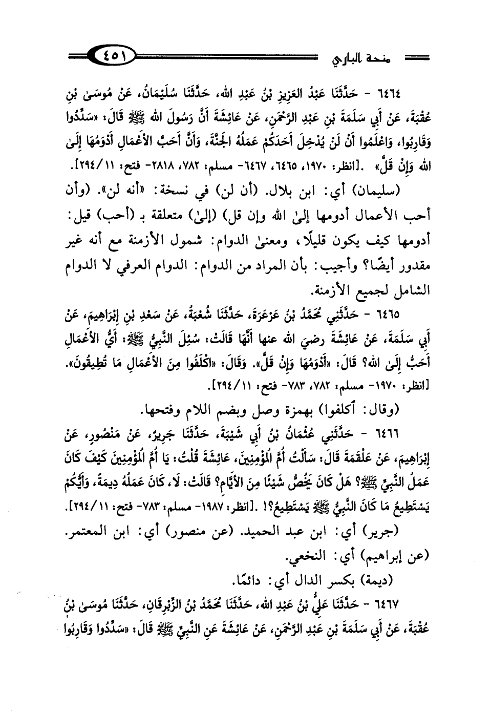 6466 - حَدَّثَنِي عُثْمَانُ بْنُ أَبِي شَيْبَةَ، حَدَّثَنَا جَرِيرٌ، عَنْ مَنْصُورٍ، عَنْ إِبْرَاهِيمَ، عَنْ عَلْقَمَةَ، قَال: سَأَلْتُ أُمَّ المُؤْمِنِينَ عَائِشَةَ، قُلْتُ: يَا أُمَّ المُؤْمِنِينَ، كَيْفَ كَانَ عَمَلُ النَّبِيِّ صَلَّى اللهُ عَلَيْهِ وَسَلَّمَ، هَلْ كَانَ يَخُصُّ شَيْئًا مِنَ الأَيَّامِ؟ قَالتْ: "لَا، كَانَ عَمَلُهُ دِيمَةً، وَأَيُّكُمْ يَسْتَطِيعُ مَا كَانَ النَّبِيُّ صَلَّى اللهُ عَلَيْهِ وَسَلَّمَ يَسْتَطِيعُ؟!.