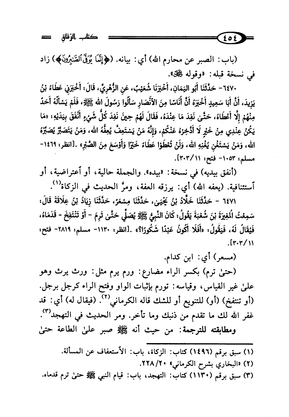 6471 - حَدَّثَنَا خَلَّادُ بْنُ يَحْيَى، حَدَّثَنَا مِسْعَرٌ، حَدَّثَنَا زِيَادُ بْنُ عِلاقَةَ، قَال: سَمِعْتُ المُغِيرَةَ بْنَ شُعْبَةَ، يَقُولُ: كَانَ النَّبِيُّ صَلَّى اللهُ عَلَيْهِ وَسَلَّمَ يُصَلِّي حَتَّى تَرِمَ، أَوْ تَنْتَفِخَ قَدَمَاهُ، فَيُقَالُ لَهُ، فَيَقُولُ: "أَفَلا أَكُونُ عَبْدًا شَكُورًا".