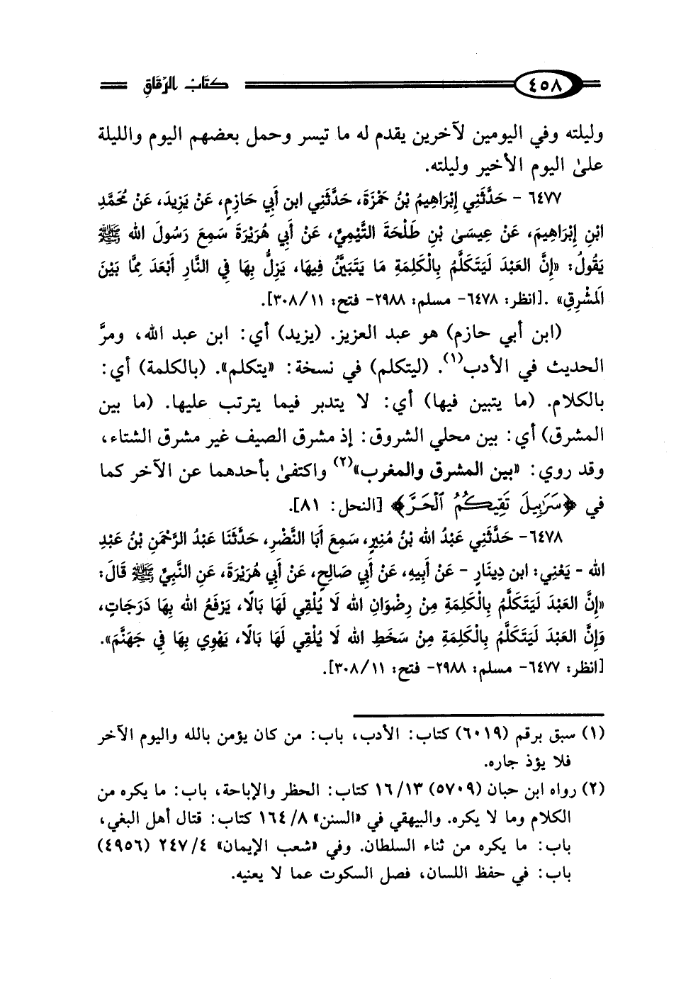 6478 - حَدَّثَنِي عَبْدُ اللَّهِ بْنُ مُنِيرٍ، سَمِعَ أَبَا النَّضْرِ، حَدَّثَنَا عَبْدُ الرَّحْمَنِ بْنُ عَبْدِ اللَّهِ يَعْني ابْنَ دِينَارٍ، عَنْ أَبِيهِ، عَنْ أَبِي صَالِحٍ، عَنْ أَبِي هُرَيْرَةَ، عَنِ النَّبِيِّ صَلَّى اللهُ عَلَيْهِ وَسَلَّمَ قَال: "إِنَّ العَبْدَ لَيَتَكَلَّمُ بِالكَلِمَةِ مِنْ رِضْوَانِ اللَّهِ، لَا يُلْقِي لَهَا بَالًا، يَرْفَعُهُ اللَّهُ بِهَا دَرَجَاتٍ، وَإِنَّ العَبْدَ لَيَتَكَلَّمُ بِالكَلِمَةِ مِنْ سَخَطِ اللَّهِ، لَا يُلْقِي لَهَا بَالًا، يَهْوي بِهَا فِي جَهَنَّمَ".