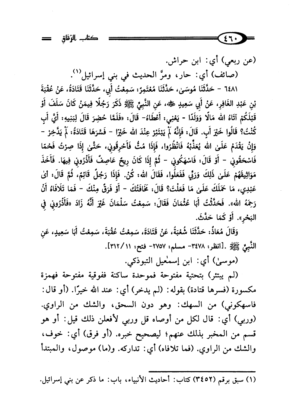 6481 - حَدَّثَنَا مُوسَى، حَدَّثَنَا مُعْتَمِرٌ، سَمِعْتُ أَبِي، حَدَّثَنَا قَتَادَةُ، عَنْ عُقْبَةَ بْنِ عَبْدِ الغَافِرِ، عَنْ أَبِي سَعِيدٍ الخُدْرِيِّ رَضِيَ اللَّهُ عَنْهُ، عَنِ النَّبِيِّ صَلَّى اللهُ عَلَيْهِ وَسَلَّمَ ذَكَرَ رَجُلًا فِيمَنْ كَانَ سَلَفَ، أَوْ قَبْلَكُمْ، آتَاهُ اللَّهُ مَالًا وَوَلَدًا - يَعْنِي أَعْطَاهُ - قَال: فَلَمَّا حُضِرَ قَال لِبَنِيهِ: أَيَّ أَبٍ كُنْتُ لَكُمْ؟ قَالُوا: خَيْرَ أَبٍ، قَال: فَإِنَّهُ لَمْ يَبْتَئِرْ عِنْدَ اللَّهِ خَيْرًا - فَسَّرَهَا قَتَادَةُ: لَمْ يَدَّخِرْ - وَإِنْ يَقْدَمْ عَلَى اللَّهِ يُعَذِّبْهُ، فَانْظُرُوا فَإِذَا مُتُّ فَأَحْرِقُونِي، حَتَّى إِذَا صِرْتُ فَحْمًا فَاسْحَقُونِي - أَوْ قَال: فَاسْهَكُونِي - ثُمَّ إِذَا كَانَ رِيحٌ عَاصِفٌ فَأَذْرُونِي فِيهَا، فَأَخَذَ مَوَاثِيقَهُمْ عَلَى ذَلِكَ - وَرَبِّي - فَفَعَلُوا، فَقَال اللَّهُ: كُنْ، فَإِذَا رَجُلٌ قَائِمٌ، ثُمَّ قَال: أَيْ عَبْدِي مَا حَمَلَكَ عَلَى مَا فَعَلْتَ؟ قَال: مَخَافَتُكَ - أَوْ فَرَقٌ مِنْكَ - فَمَا تَلافَاهُ أَنْ رَحِمَهُ اللَّهُ"، فَحَدَّثْتُ أَبَا عُثْمَانَ، فَقَال: سَمِعْتُ سَلْمَانَ، غَيْرَ أَنَّهُ زَادَ: "فَأَذْرُونِي فِي البَحْرِ" أَوْ كَمَا حَدَّثَ وَقَال مُعَاذٌ: حَدَّثَنَا شُعْبَةُ، عَنْ قَتَادَةَ، سَمِعْتُ عُقْبَةَ، سَمِعْتُ أَبَا سَعِيدٍ الخُدْرِيَّ، عَنِ النَّبِيِّ صَلَّى اللهُ عَلَيْهِ وَسَلَّمَ.