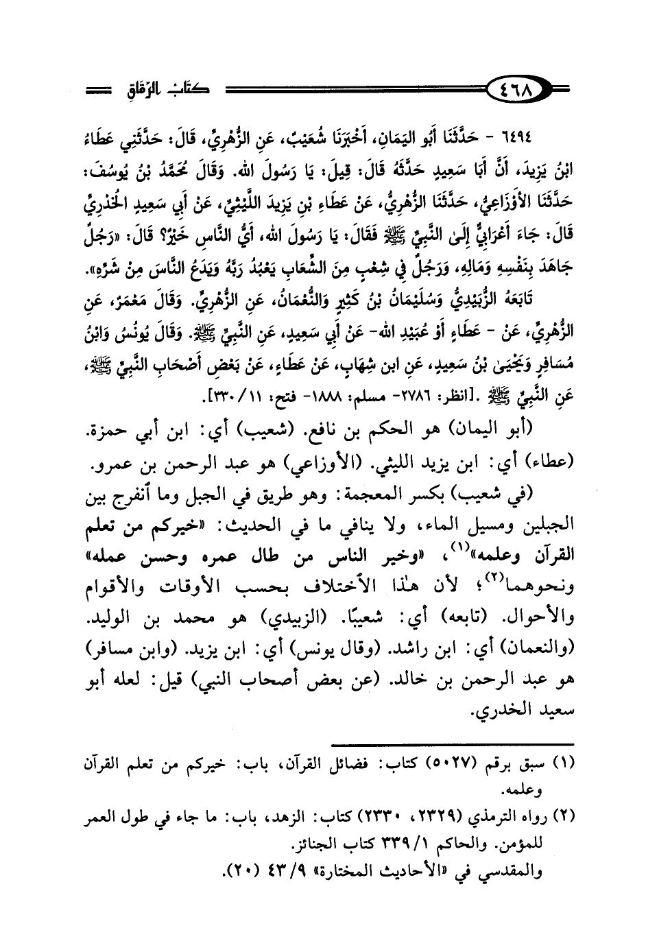 6494 - حَدَّثَنَا أَبُو اليَمَانِ، أَخْبَرَنَا شُعَيْبٌ، عَنِ الزُّهْرِيِّ، قَال: حَدَّثَنِي عَطَاءُ بْنُ يَزِيدَ، أَنَّ أَبَا سَعِيدٍ، حَدَّثَهُ قَال: قِيلَ يَا رَسُولَ اللَّهِ، وَقَال مُحَمَّدُ بْنُ يُوسُفَ، حَدَّثَنَا الأَوْزَاعِيُّ، حَدَّثَنَا الزُّهْرِيُّ، عَنْ عَطَاءِ بْنِ يَزِيدَ اللَّيْثِيِّ، عَنْ أَبِي سَعِيدٍ الخُدْرِيِّ، قَال: جَاءَ أَعْرَابِيٌّ إِلَى النَّبِيِّ صَلَّى اللهُ عَلَيْهِ وَسَلَّمَ فَقَال: يَا رَسُولَ اللَّهِ أَيُّ النَّاسِ خَيْرٌ؟ قَال: "رَجُلٌ جَاهَدَ بِنَفْسِهِ وَمَالِهِ، وَرَجُلٌ فِي شِعْبٍ مِنَ الشِّعَابِ: يَعْبُدُ رَبَّهُ، وَيَدَعُ النَّاسَ مِنْ شَرِّهِ " تَابَعَهُ الزُّبَيْدِيُّ، وَسُلَيْمَانُ بْنُ كَثِيرٍ، وَالنُّعْمَانُ، عَنِ الزُّهْرِيِّ وَقَال مَعْمَرٌ عَنِ الزُّهْرِيِّ، عَنْ عَطَاءٍ، أَوْ عُبَيْدِ اللَّهِ، عَنْ أَبِي سَعِيدٍ، عَنِ النَّبِيِّ صَلَّى اللهُ عَلَيْهِ وَسَلَّمَ، وَقَال يُونُسُ، وَابْنُ مُسَافِرٍ، وَيَحْيَى بْنُ سَعِيدٍ، عَنْ ابْنِ شِهَابٍ، عَنْ عَطَاءٍ، عَنْ بَعْضِ أَصْحَابِ النَّبِيِّ صَلَّى اللهُ عَلَيْهِ وَسَلَّمَ، عَنِ النَّبِيِّ صَلَّى اللهُ عَلَيْهِ وَسَلَّمَ.