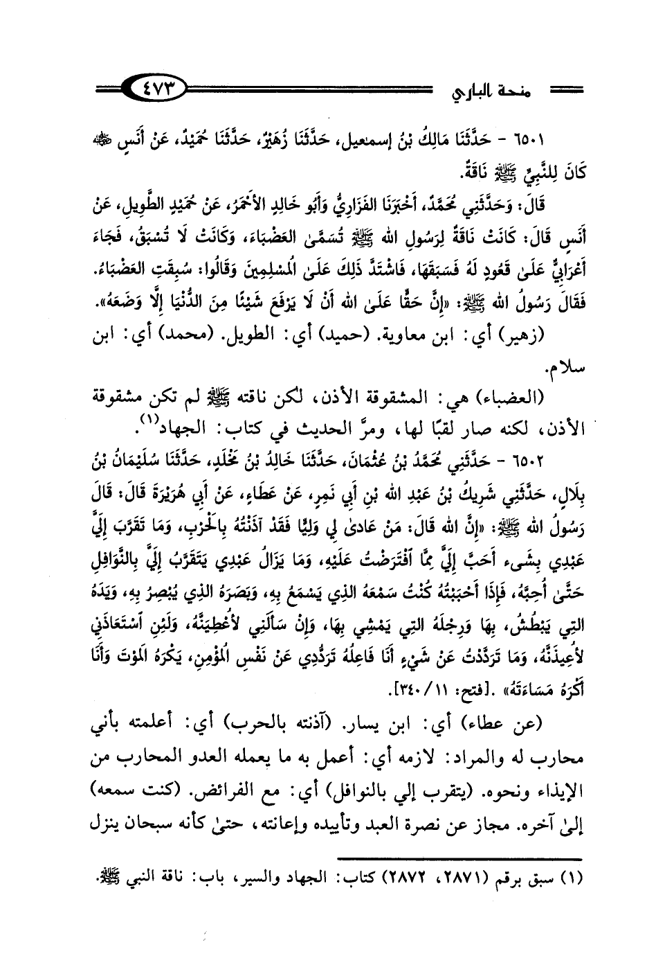 6501 - حَدَّثَنَا مَالِكُ بْنُ إِسْمَاعِيلَ، حَدَّثَنَا زُهَيْرٌ، حَدَّثَنَا حُمَيْدٌ، عَنْ أَنَسٍ رَضِيَ اللَّهُ عَنْهُ - كَانَ لِلنَّبِيِّ صَلَّى اللهُ عَلَيْهِ وَسَلَّمَ نَاقَةٌ - قَال: ح وَحَدَّثَنِي مُحَمَّدٌ: أَخْبَرَنَا الفَزَارِيُّ، وَأَبُو خَالِدٍ الأَحْمَرُ، عَنْ حُمَيْدٍ الطَّويلِ، عَنْ أَنَسٍ، قَال: كَانَتْ نَاقَةٌ لِرَسُولِ اللَّهِ صَلَّى اللهُ عَلَيْهِ وَسَلَّمَ تُسَمَّى: العَضْبَاءَ، وَكَانَتْ لَا تُسْبَقُ، فَجَاءَ أَعْرَابِيٌّ عَلَى قَعُودٍ لَهُ فَسَبَقَهَا، فَاشْتَدَّ ذَلِكَ عَلَى المُسْلِمِينَ، وَقَالُوا: سُبِقَتِ العَضْبَاءُ، فَقَال رَسُولُ اللَّهِ صَلَّى اللهُ عَلَيْهِ وَسَلَّمَ: "إِنَّ حَقًّا عَلَى اللَّهِ أَنْ لَا يَرْفَعَ شَيْئًا مِنَ الدُّنْيَا إلا وَضَعَهُ".