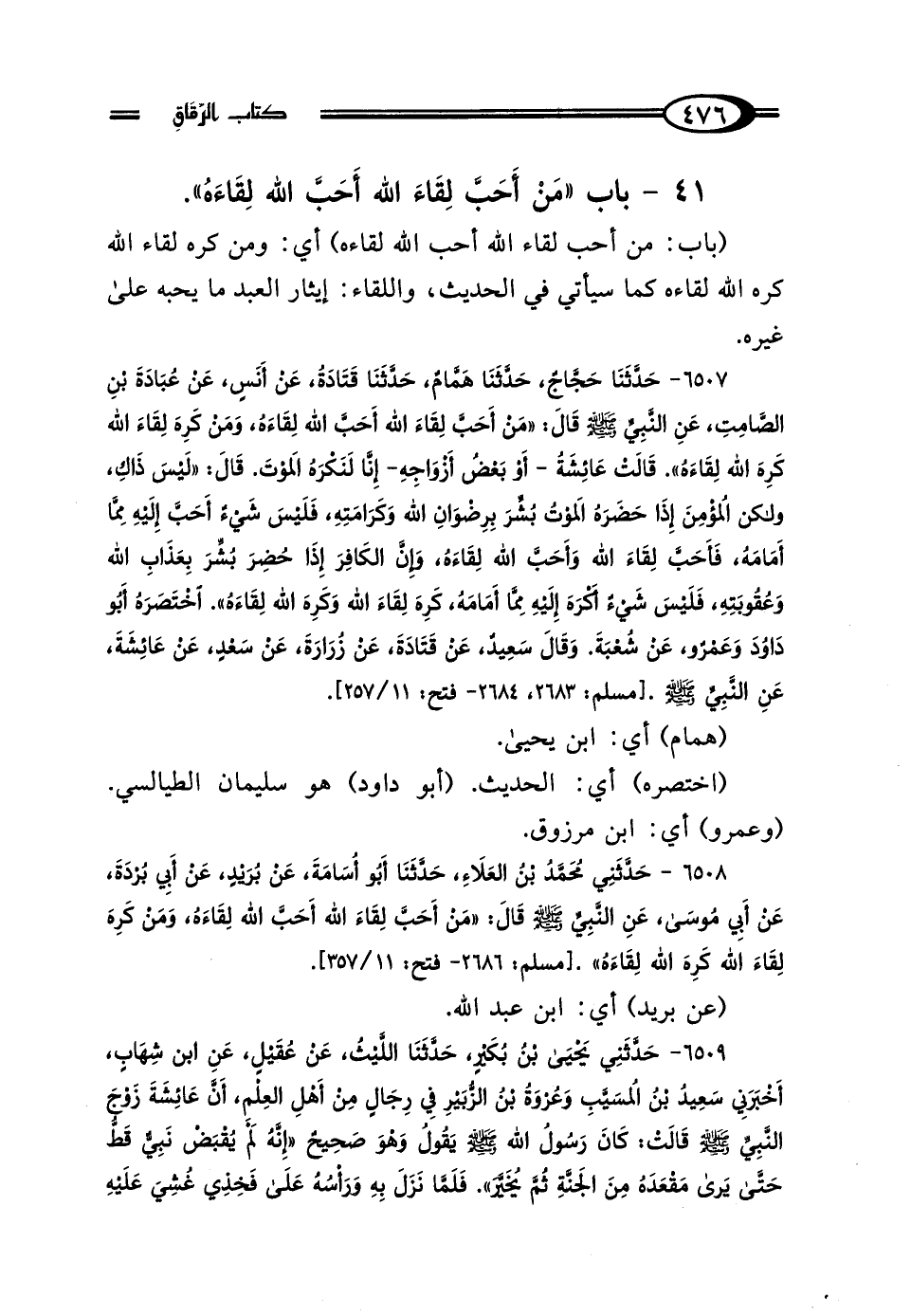 6507 - حَدَّثَنَا حَجَّاجٌ، حَدَّثَنَا هَمَّامٌ، حَدَّثَنَا قَتَادَةُ، عَنْ أَنَسٍ، عَنْ عُبَادَةَ بْنِ الصَّامِتِ، عَنِ النَّبِيِّ صَلَّى اللهُ عَلَيْهِ وَسَلَّمَ قَال: "مَنْ أَحَبَّ لِقَاءَ اللَّهِ أَحَبَّ اللَّهُ لِقَاءَهُ، وَمَنْ كَرِهَ لِقَاءَ اللَّهِ كَرِهَ اللَّهُ لِقَاءَهُ" قَالتْ عَائِشَةُ أَوْ بَعْضُ أَزْوَاجِهِ: إِنَّا لَنَكْرَهُ المَوْتَ، قَال: "لَيْسَ ذَاكِ، وَلَكِنَّ المُؤْمِنَ إِذَا حَضَرَهُ المَوْتُ بُشِّرَ بِرِضْوَانِ اللَّهِ وَكَرَامَتِهِ، فَلَيْسَ شَيْءٌ أَحَبَّ إِلَيْهِ مِمَّا أَمَامَهُ، فَأَحَبَّ لِقَاءَ اللَّهِ وَأَحَبَّ اللَّهُ لِقَاءَهُ، وَإِنَّ الكَافِرَ إِذَا حُضِرَ بُشِّرَ بِعَذَابِ اللَّهِ وَعُقُوبَتِهِ، فَلَيْسَ شَيْءٌ أَكْرَهَ إِلَيْهِ مِمَّا أَمَامَهُ، كَرِهَ لِقَاءَ اللَّهِ وَكَرِهَ اللَّهُ لِقَاءَهُ" اخْتَصَرَهُ أَبُو دَاوُدَ، وَعَمْرٌو، عَنْ شُعْبَةَ، وَقَال سَعِيدٌ، عَنْ قَتَادَةَ، عَنْ زُرَارَةَ، عَنْ سَعْدٍ، عَنْ عَائِشَةَ، عَنِ النَّبِيِّ صَلَّى اللهُ عَلَيْهِ وَسَلَّمَ.
