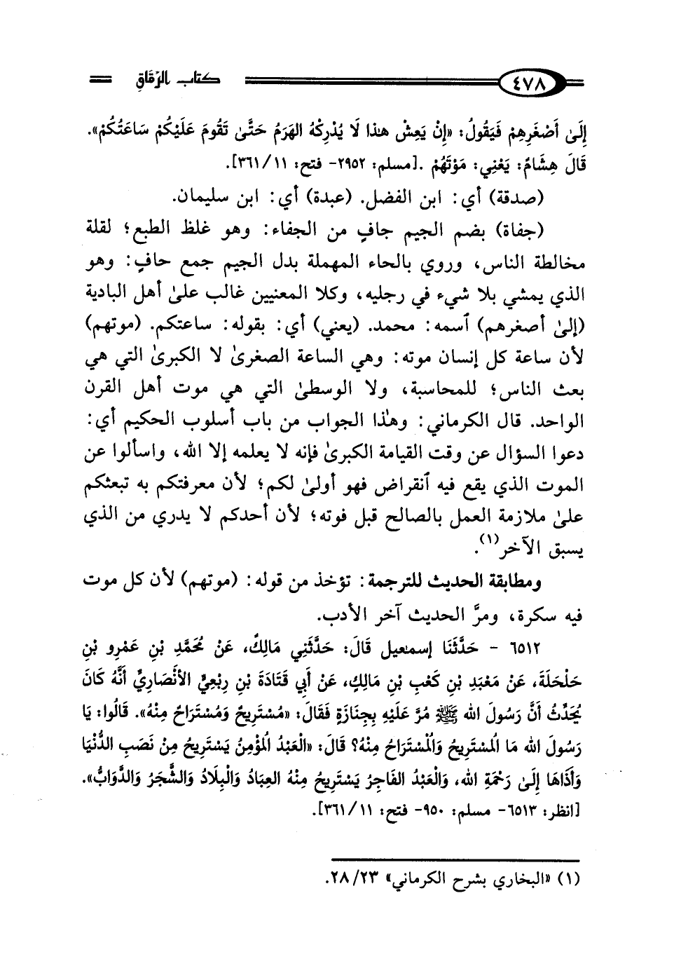 (جفاة) بضم الجيم جافٍ من الجفاء: وهو غلظ الطبع؛ لقلة مخالطة الناس، وروي بالحاء المهملة بدل الجيم جمع حافٍ: وهو الذي يمشي بلا شيء في رجليه، وكلا المعنيين غالب على أهل البادية (إلى أصغرهم) اسمه: محمد. (يعني) أي: بقوله: ساعتكم. (موتهم) لأن ساعة كل إنسان موته: وهي الساعة الصغرى لا الكبرى التي هي بعث الناس؛ للمحاسبة، ولا الوسطى التي هي موت أهل القرن الواحد. قال الكرماني: وهذا الجواب من باب أسلوب الحكيم أي: دعوا السؤال عن وقت القيامة الكبرى فإنه لا يعلمه إلا اللَّه، واسألوا عن الموت الذي يقع فيه انقراض فهو أولى لكم؛ لأن معرفتكم به تبعثكم على ملازمة العمل بالصالح قبل فوته؛ لأن أحدكم لا يدري من الذي يسبق الآخر (¬1).