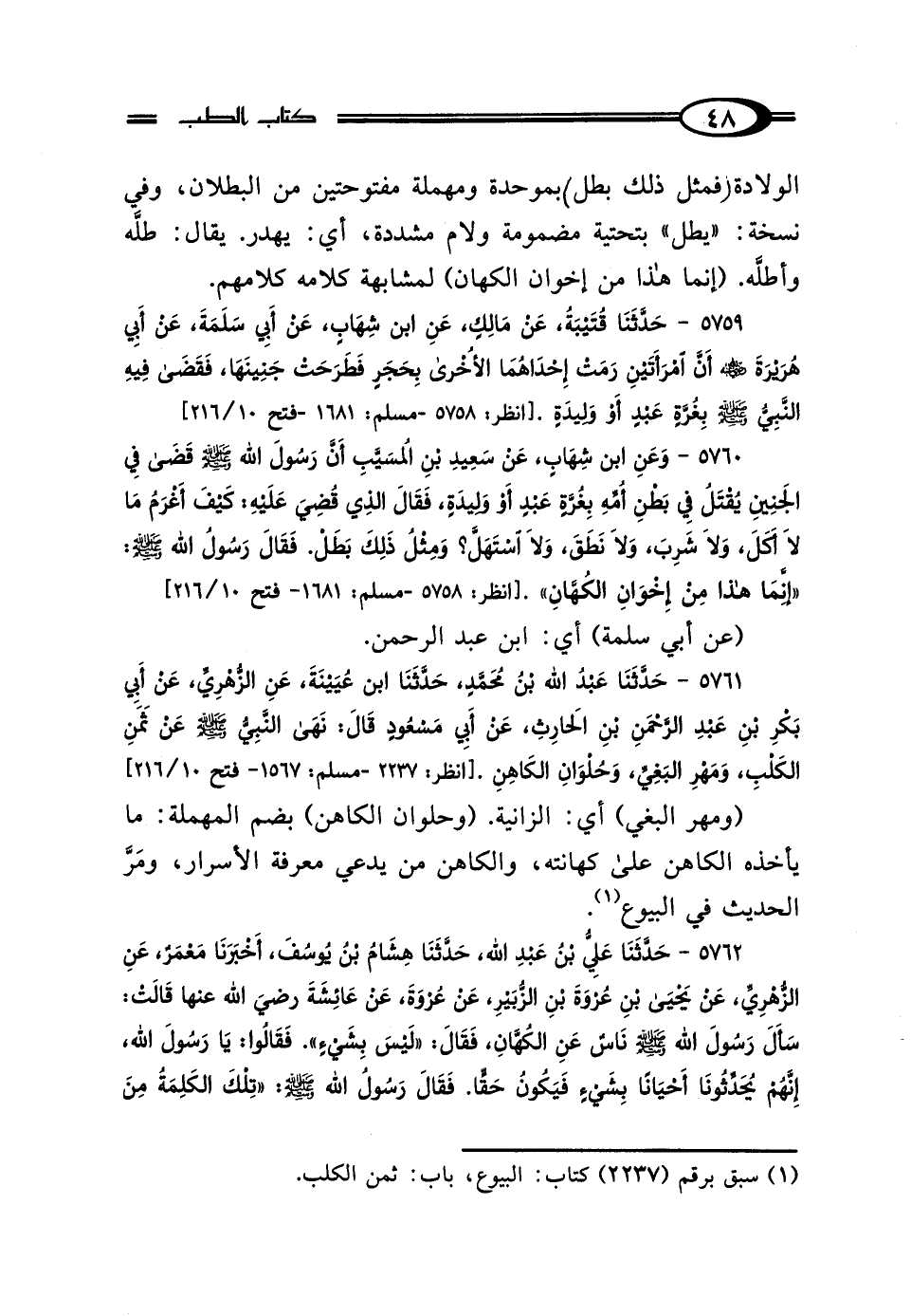 5761 - حَدَّثَنَا عَبْدُ اللَّهِ بْنُ مُحَمَّدٍ، حَدَّثَنَا ابْنُ عُيَيْنَةَ، عَنِ الزُّهْرِيِّ، عَنْ أَبِي بَكْرِ بْنِ عَبْدِ الرَّحْمَنِ بْنِ الحَارِثِ، عَنْ أَبِي مَسْعُودٍ، قَال: "نَهَى النَّبِيُّ صَلَّى اللهُ عَلَيْهِ وَسَلَّمَ عَنْ ثَمَنِ الكَلْبِ، وَمَهْرِ البَغِيِّ، وَحُلْوَانِ الكَاهِنِ".