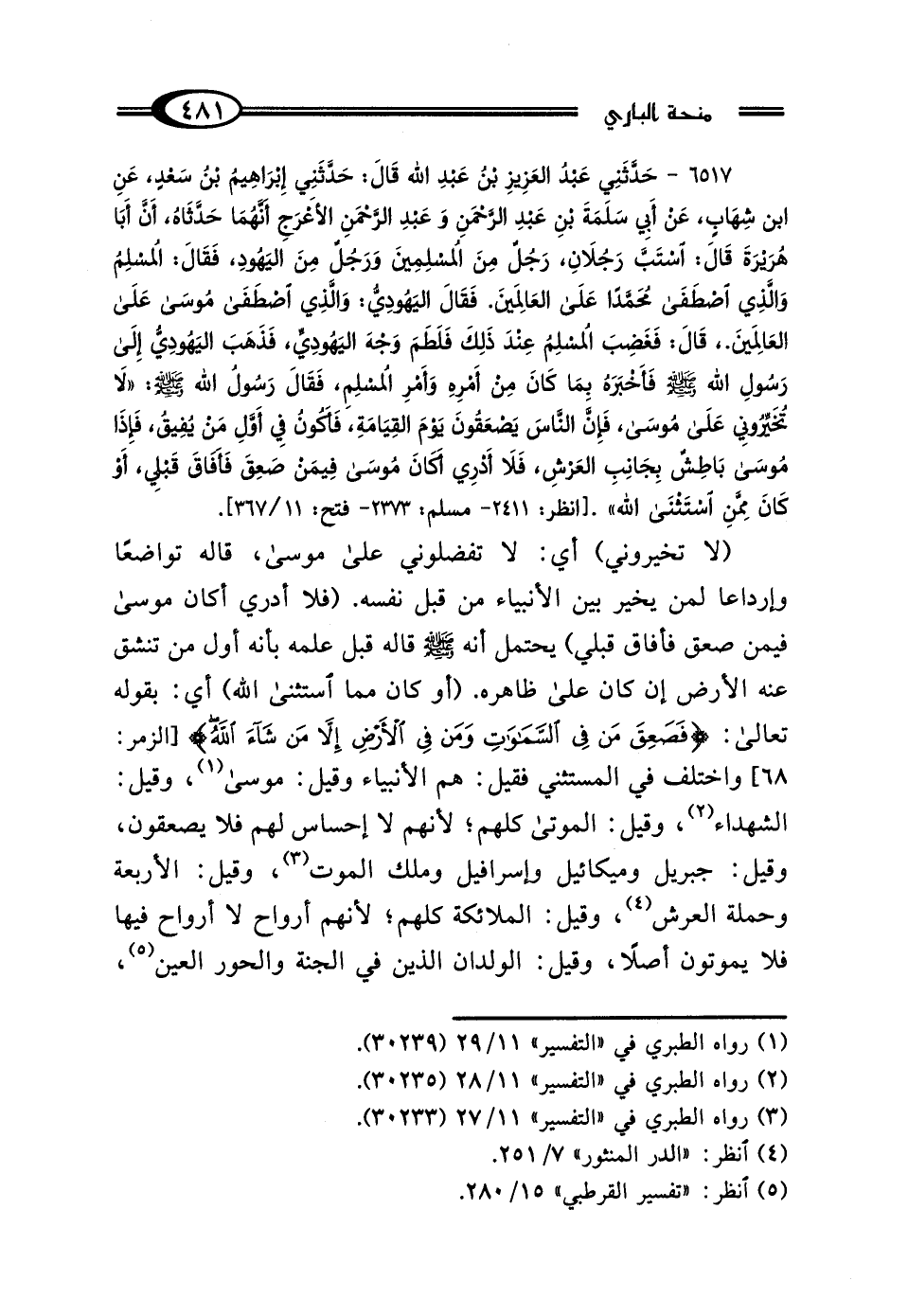 6517 - حَدَّثَنِي عَبْدُ العَزِيزِ بْنُ عَبْدِ اللَّهِ، قَال: حَدَّثَنِي إِبْرَاهِيمُ بْنُ سَعْدٍ، عَنِ ابْنِ شِهَابٍ، عَنْ أَبِي سَلَمَةَ بْنِ عَبْدِ الرَّحْمَنِ، وَعَبْدِ الرَّحْمَنِ الأَعْرَجِ، أَنَّهُمَا حَدَّثَاهُ: أَنَّ أَبَا هُرَيْرَةَ، قَال: اسْتَبَّ رَجُلانِ: رَجُلٌ مِنَ المُسْلِمِينَ، وَرَجُلٌ مِنَ اليَهُودِ، فَقَال المُسْلِمُ: وَالَّذِي اصْطَفَى مُحَمَّدًا عَلَى العَالمِينَ، فَقَال اليَهُودِيُّ: وَالَّذِي اصْطَفَى مُوسَى عَلَى العَالمِينَ، قَال: فَغَضِبَ المُسْلِمُ عِنْدَ ذَلِكَ فَلَطَمَ وَجْهَ اليَهُودِيِّ، فَذَهَبَ اليَهُودِيُّ إِلَى رَسُولِ اللَّهِ صَلَّى اللهُ عَلَيْهِ وَسَلَّمَ، فَأَخْبَرَهُ بِمَا كَانَ مِنْ أَمْرِهِ وَأَمْرِ المُسْلِمِ، فَقَال رَسُولُ اللَّهِ صَلَّى اللهُ عَلَيْهِ وَسَلَّمَ: "لَا تُخَيِّرُونِي عَلَى مُوسَى، فَإِنَّ النَّاسَ يَصْعَقُونَ يَوْمَ القِيَامَةِ، فَأَكُونُ فِي أَوَّلِ مَنْ يُفِيقُ، فَإِذَا مُوسَى بَاطِشٌ بِجَانِبِ العَرْشِ، فَلَا أَدْرِي أَكَانَ مُوسَى فِيمَنْ صَعِقَ فَأَفَاقَ قَبْلِي، أَوْ كَانَ مِمَّنِ اسْتَثْنَى اللَّهُ".