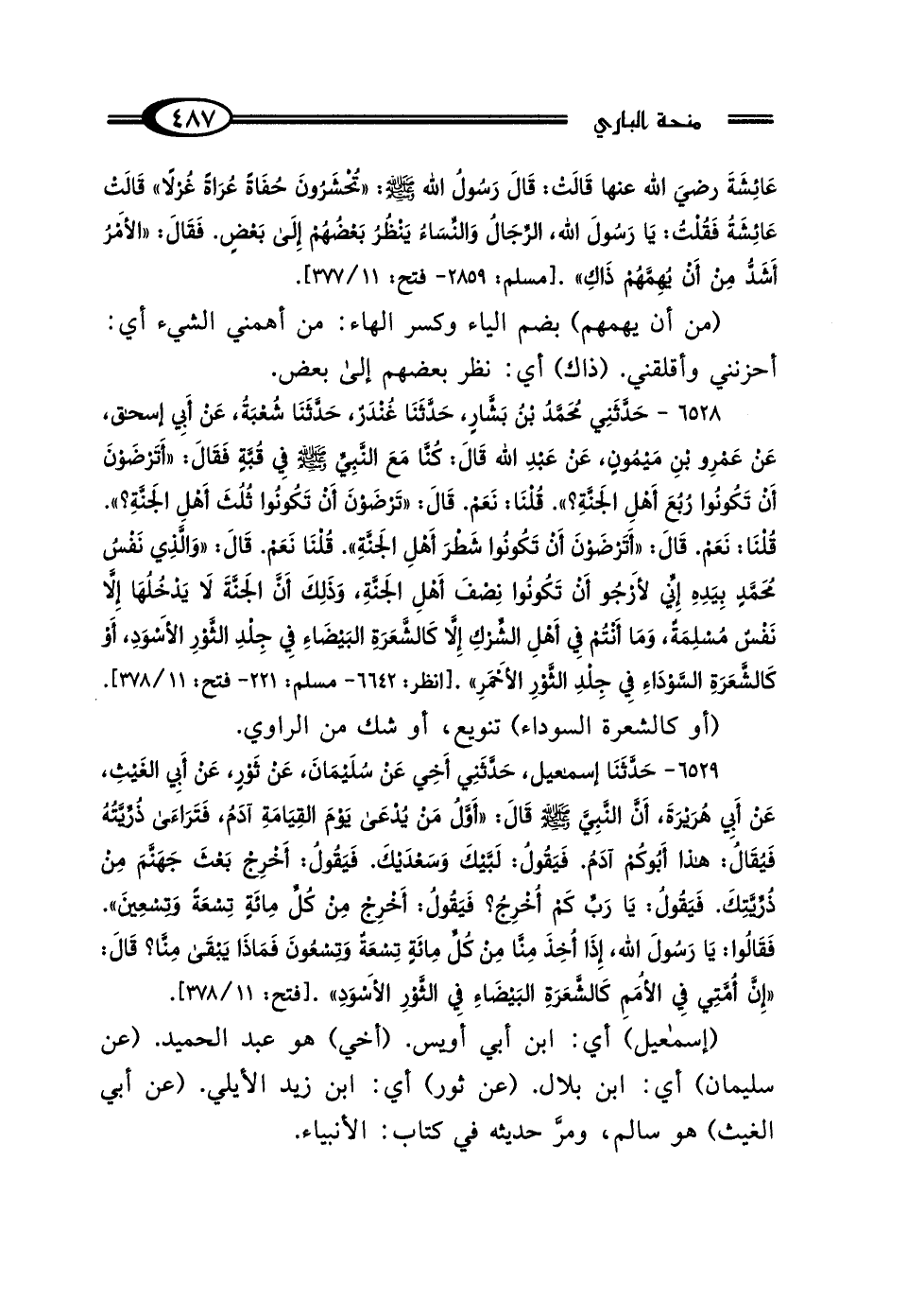 عَائِشَةَ رَضِيَ اللَّهُ عَنْهَا، قَالتْ: قَال رَسُولُ اللَّهِ صَلَّى اللهُ عَلَيْهِ وَسَلَّمَ: "تُحْشَرُونَ حُفَاةً عُرَاةً غُرْلًا" قَالتْ عَائِشَةُ: فَقُلْتُ: يَا رَسُولَ اللَّهِ، الرِّجَالُ وَالنِّسَاءُ يَنْظُرُ بَعْضُهُمْ إِلَى بَعْضٍ؟ فَقَال: "الأَمْرُ أَشَدُّ مِنْ أَنْ يُهِمَّهُمْ ذَاكِ".