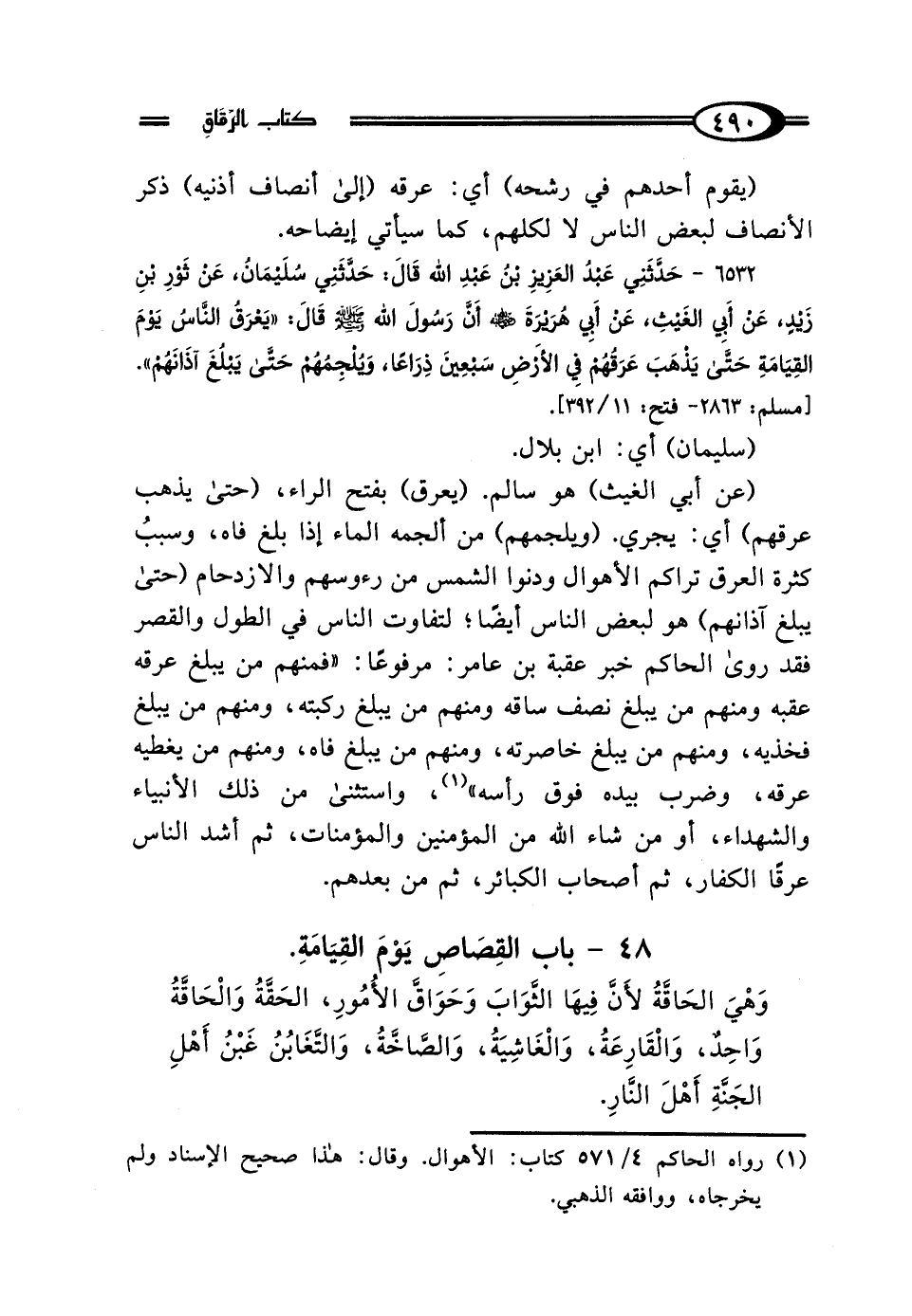 6532 - حَدَّثَنِي عَبْدُ العَزِيزِ بْنُ عَبْدِ اللَّهِ، قَال: حَدَّثَنِي سُلَيْمَانُ، عَنْ ثَوْرِ بْنِ زَيْدٍ، عَنْ أَبِي الغَيْثِ، عَنْ أَبِي هُرَيْرَةَ رَضِيَ اللَّهُ عَنْهُ: أَنَّ رَسُولَ اللَّهِ صَلَّى اللهُ عَلَيْهِ وَسَلَّمَ قَال: "يَعْرَقُ النَّاسُ يَوْمَ القِيَامَةِ حَتَّى يَذْهَبَ عَرَقُهُمْ فِي الأَرْضِ سَبْعِينَ ذِرَاعًا، وَيُلْجِمُهُمْ حَتَّى يَبْلُغَ آذَانَهُمْ".