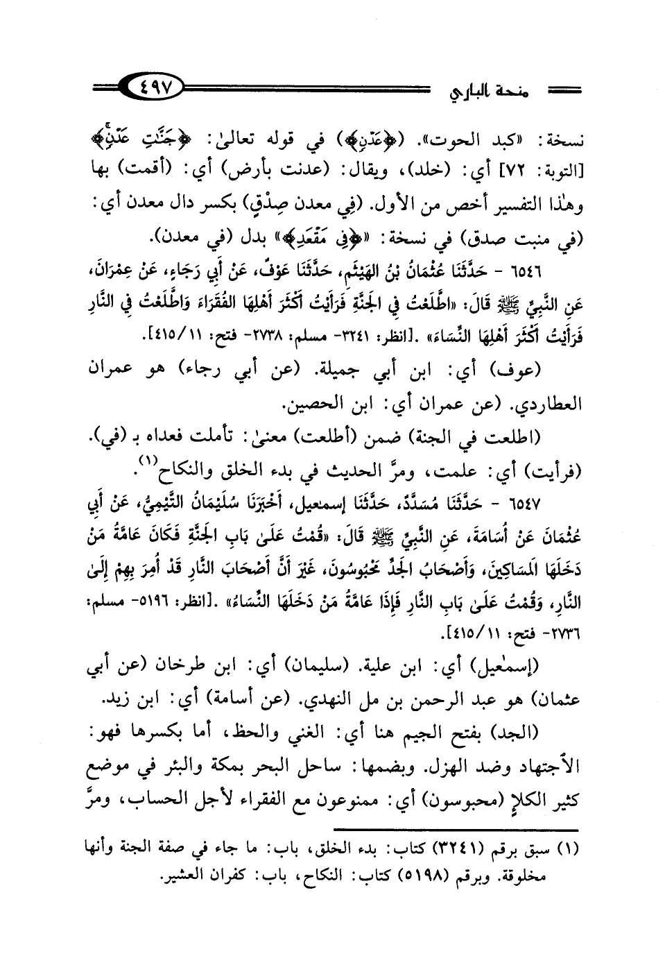 6547 - حَدَّثَنَا مُسَدَّدٌ، حَدَّثَنَا إِسْمَاعِيلُ، أَخْبَرَنَا سُلَيْمَانُ التَّيْمِيُّ، عَنْ أَبِي عُثْمَانَ، عَنْ أُسَامَةَ، عَنِ النَّبِيِّ صَلَّى اللهُ عَلَيْهِ وَسَلَّمَ قَال: "قُمْتُ عَلَى بَابِ الجَنَّةِ، فَكَانَ عَامَّةُ مَنْ دَخَلَهَا المَسَاكِينَ، وَأَصْحَابُ الجَدِّ مَحْبُوسُونَ، غَيْرَ أَنَّ أَصْحَابَ النَّارِ قَدْ أُمِرَ بِهِمْ إِلَى النَّارِ، وَقُمْتُ عَلَى بَابِ النَّارِ فَإِذَا عَامَّةُ مَنْ دَخَلَهَا النِّسَاءُ".