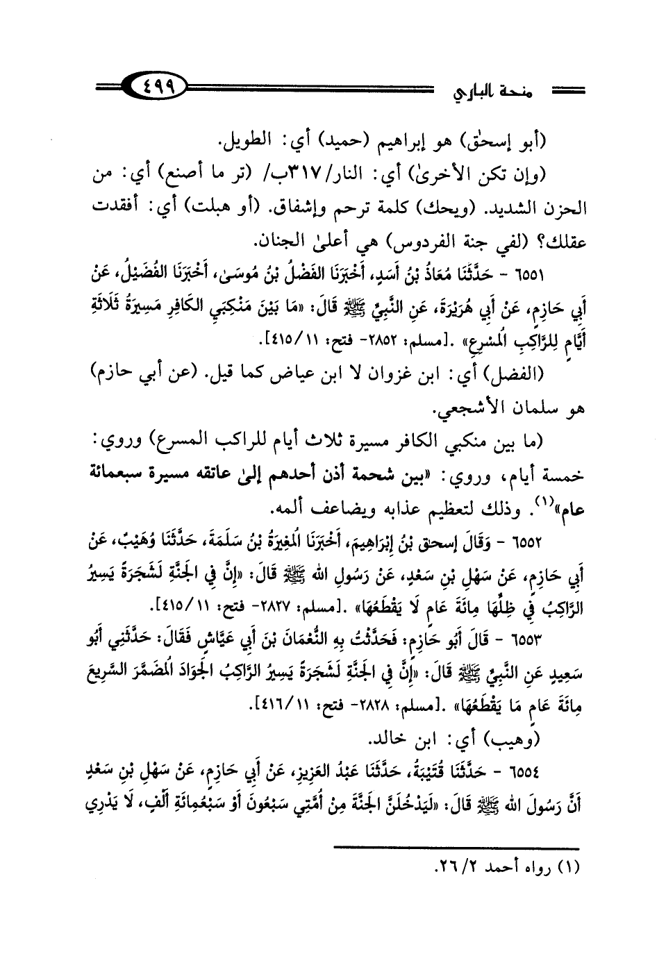 6551 - حَدَّثَنَا مُعَاذُ بْنُ أَسَدٍ، أَخْبَرَنَا الفَضْلُ بْنُ مُوسَى، أَخْبَرَنَا الفُضَيْلُ، عَنْ أَبِي حَازِمٍ، عَنْ أَبِي هُرَيْرَةَ، عَنِ النَّبِيِّ صَلَّى اللهُ عَلَيْهِ وَسَلَّمَ قَال: "مَا بَيْنَ مَنْكِبَيِ الكَافِرِ مَسِيرَةُ ثَلاثَةِ أَيَّامٍ للرَّاكِبِ المُسْرِعِ".