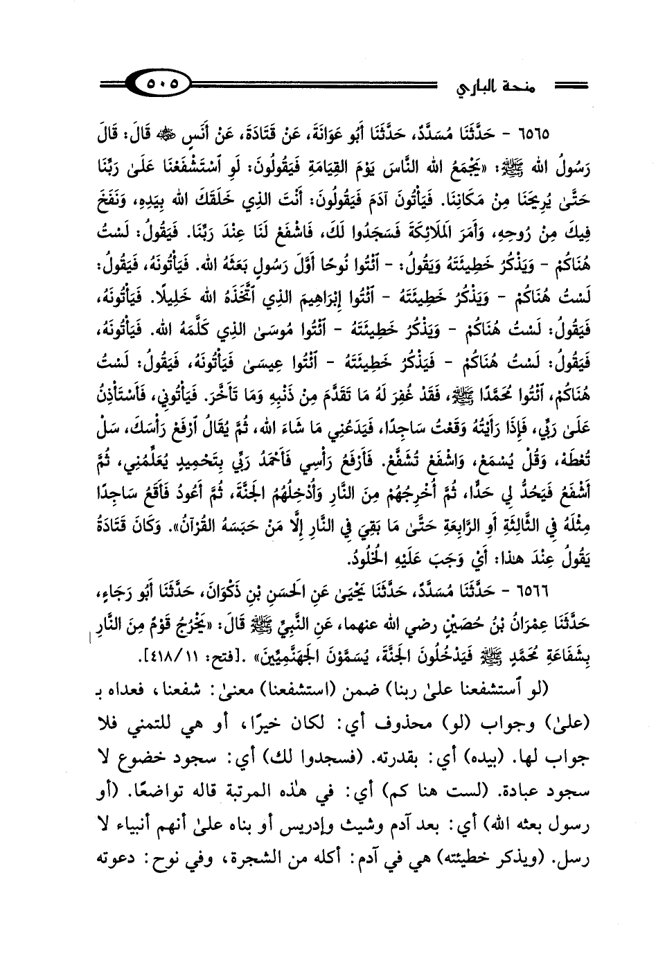 6566 - حَدَّثَنَا مُسَدَّدٌ، حَدَّثَنَا يَحْيَى، عَنِ الحَسَنِ بْنِ ذَكْوَانَ، حَدَّثَنَا أَبُو رَجَاءٍ، حَدَّثَنَا عِمْرَانُ بْنُ حُصَيْنٍ رَضِيَ اللَّهُ عَنْهُمَا، عَنِ النَّبِيِّ صَلَّى اللهُ عَلَيْهِ وَسَلَّمَ قَال: "يَخْرُجُ قَوْمٌ مِنَ النَّارِ بِشَفَاعَةِ مُحَمَّدٍ صَلَّى اللهُ عَلَيْهِ وَسَلَّمَ فَيَدْخُلُونَ الجَنَّةَ، يُسَمَّوْنَ الجَهَنَّمِيِّينَ".