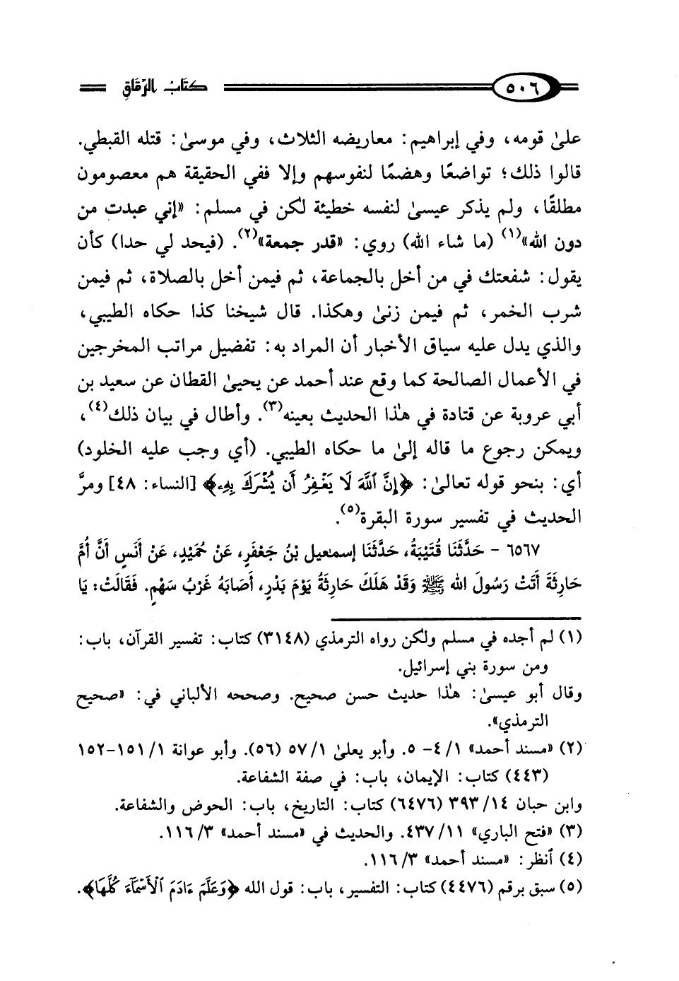 6567 - حَدَّثَنَا قُتَيْبَةُ، حَدَّثَنَا إِسْمَاعِيلُ بْنُ جَعْفَرٍ، عَنْ حُمَيْدٍ، عَنْ أَنَسٍ: أَنَّ أُمَّ حَارِثَةَ أَتَتْ رَسُولَ اللَّهِ صَلَّى اللهُ عَلَيْهِ وَسَلَّمَ، وَقَدْ هَلَكَ حَارِثَةُ يَوْمَ بَدْرٍ، أَصَابَهُ غَرْبُ سَهْمٍ، فَقَالَتْ: يَا