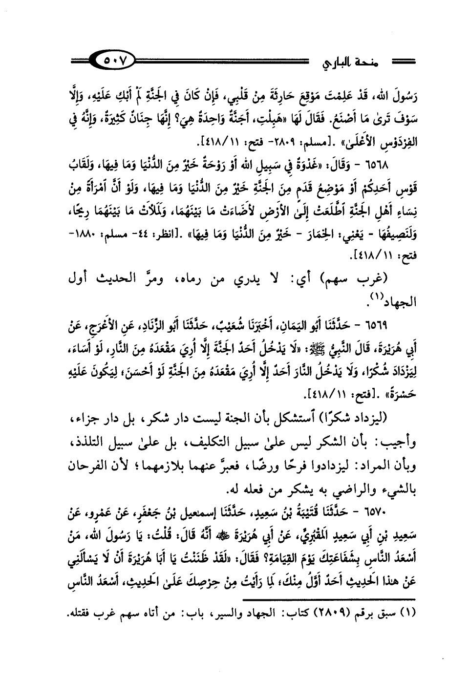 6569 - حَدَّثَنَا أَبُو اليَمَانِ، أَخْبَرَنَا شُعَيْبٌ، حَدَّثَنَا أَبُو الزِّنَادِ، عَنِ الأَعْرَجِ، عَنْ أَبِي هُرَيْرَةَ، قَال النَّبِيُّ صَلَّى اللهُ عَلَيْهِ وَسَلَّمَ: "لَا يَدْخُلُ أَحَدٌ الجَنَّةَ إلا أُرِيَ مَقْعَدَهُ مِنَ النَّارِ لَوْ أَسَاءَ، لِيَزْدَادَ شُكْرًا، وَلَا يَدْخُلُ النَّارَ أَحَدٌ إلا أُرِيَ مَقْعَدَهُ مِنَ الجَنَّةِ لَوْ أَحْسَنَ، لِيَكُونَ عَلَيْهِ حَسْرَةً".
