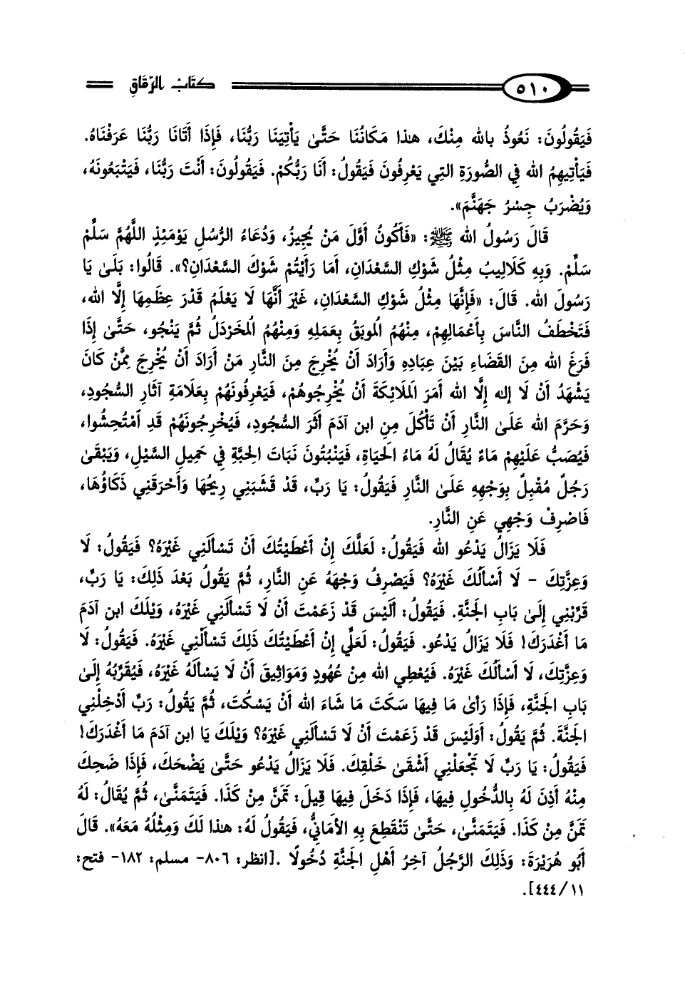 فَيَقُولُونَ: نَعُوذُ بِاللَّهِ مِنْكَ، هَذَا مَكَانُنَا حَتَّى يَأْتِيَنَا رَبُّنَا، فَإِذَا أَتَانَا رَبُّنَا عَرَفْنَاهُ، فَيَأْتِيهِمُ اللَّهُ فِي الصُّورَةِ الَّتِي يَعْرِفُونَ، فَيَقُولُ: أَنَا رَبُّكُمْ، فَيَقُولُونَ: أَنْتَ رَبُّنَا فَيَتْبَعُونَهُ، وَيُضْرَبُ جِسْرُ جَهَنَّمَ " قَال رَسُولُ اللَّهِ صَلَّى اللهُ عَلَيْهِ وَسَلَّمَ: "فَأَكُونُ أَوَّلَ مَنْ يُجِيزُ، وَدُعَاءُ الرُّسُلِ يَوْمَئِذٍ: اللَّهُمَّ سَلِّمْ سَلِّمْ. وَبِهِ كَلالِيبُ مِثْلُ شَوْكِ السَّعْدَانِ، أَمَا رَأَيْتُمْ شَوْكَ السَّعْدَانِ؟ " قَالُوا: بَلَى يَا رَسُولَ اللَّهِ، قَال: "فَإِنَّهَا مِثْلُ شَوْكِ السَّعْدَانِ، غَيْرَ أَنَّهَا لَا يَعْلَمُ قَدْرَ عِظَمِهَا إلا اللَّهُ، فَتَخْطَفُ النَّاسَ بِأَعْمَالِهِمْ، مِنْهُمُ المُوبَقُ بِعَمَلِهِ، وَمِنْهُمُ المُخَرْدَلُ، ثُمَّ يَنْجُو حَتَّى إِذَا فَرَغَ اللَّهُ مِنَ القَضَاءِ بَيْنَ عِبَادِهِ، وَأَرَادَ أَنْ يُخْرِجَ مِنَ النَّارِ مَنْ أَرَادَ أَنْ يُخْرِجَ، مِمَّنْ كَانَ يَشْهَدُ أَنْ لَا إِلَهَ إلا اللَّهُ، أَمَرَ المَلائِكَةَ أَنْ يُخْرِجُوهُمْ، فَيَعْرِفُونَهُمْ بِعَلامَةِ آثَارِ السُّجُودِ، وَحَرَّمَ اللَّهُ عَلَى النَّارِ أَنْ تَأْكُلَ مِنَ ابْنِ آدَمَ أَثَرَ السُّجُودِ، فَيُخْرِجُونَهُمْ قَدْ امْتُحِشُوا، فَيُصَبُّ عَلَيْهِمْ مَاءٌ يُقَالُ لَهُ مَاءُ الحَيَاةِ، فَيَنْبُتُونَ نَبَاتَ الحِبَّةِ فِي حَمِيلِ السَّيْلِ، وَيَبْقَى رَجُلٌ مِنْهُمْ مُقْبِلٌ بِوَجْهِهِ عَلَى النَّارِ، فَيَقُولُ: يَا رَبِّ، قَدْ قَشَبَنِي رِيحُهَا، وَأَحْرَقَنِي ذَكَاؤُهَا، فَاصْرِفْ وَجْهِي عَنِ النَّارِ، فَلا يَزَالُ يَدْعُو اللَّهَ، فَيَقُولُ: لَعَلَّكَ إِنْ أَعْطَيْتُكَ أَنْ تَسْأَلَنِي غَيْرَهُ، فَيَقُولُ: لَا وَعِزَّتِكَ لَا أَسْأَلُكَ غَيْرَهُ، فَيَصْرِفُ وَجْهَهُ عَنِ النَّارِ، ثُمَّ يَقُولُ بَعْدَ ذَلِكَ: يَا رَبِّ قَرِّبْنِي إِلَى بَابِ الجَنَّةِ، فَيَقُولُ: أَلَيْسَ قَدْ زَعَمْتَ أَنْ لَا تَسْأَلَنِي غَيْرَهُ، وَيْلَكَ ابْنَ آدَمَ مَا أَغْدَرَكَ، فَلَا يَزَالُ يَدْعُو، فَيَقُولُ: لَعَلِّي إِنْ أَعْطَيْتُكَ ذَلِكَ تَسْأَلُنِي غَيْرَهُ، فَيَقُولُ: لَا وَعِزَّتِكَ لَا أَسْأَلُكَ غَيْرَهُ، فَيُعْطِي اللَّهَ مِنْ عُهُودٍ وَمَوَاثِيقَ أَنْ لَا يَسْأَلَهُ غَيْرَهُ، فَيُقَرِّبُهُ إِلَى بَابِ الجَنَّةِ، فَإِذَا رَأَى مَا فِيهَا سَكَتَ مَا شَاءَ اللَّهُ أَنْ يَسْكُتَ، ثُمَّ يَقُولُ: رَبِّ أَدْخِلْنِي الجَنَّةَ، ثُمَّ يَقُولُ: أَوَلَيْسَ قَدْ زَعَمْتَ أَنْ لَا تَسْأَلَنِي غَيْرَهُ، وَيْلَكَ يَا ابْنَ آدَمَ مَا أَغْدَرَكَ، فَيَقُولُ: يَا رَبِّ لَا تَجْعَلْنِي أَشْقَى خَلْقِكَ، فَلَا يَزَالُ يَدْعُو حَتَّى يَضْحَكَ، فَإِذَا ضَحِكَ مِنْهُ أَذِنَ لَهُ بِالدُّخُولِ فِيهَا، فَإِذَا دَخَلَ فِيهَا قِيلَ لَهُ: تَمَنَّ مِنْ كَذَا، فَيَتَمَنَّى، ثُمَّ يُقَالُ لَهُ: تَمَنَّ مِنْ كَذَا، فَيَتَمَنَّى، حَتَّى تَنْقَطِعَ بِهِ الأَمَانِيُّ، فَيَقُولُ لَهُ: هَذَا لَكَ وَمِثْلُهُ مَعَهُ " قَال أَبُو هُرَيْرَةَ: "وَذَلِكَ الرَّجُلُ آخِرُ أَهْلِ الجَنَّةِ دُخُولًا".