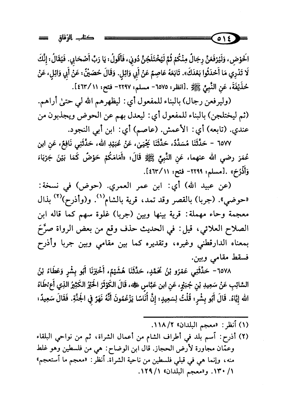 6577 - حَدَّثَنَا مُسَدَّدٌ، حَدَّثَنَا يَحْيَى، عَنْ عُبَيْدِ اللَّهِ، حَدَّثَنِي نَافِعٌ، عَنِ ابْنِ عُمَرَ رَضِيَ اللَّهُ عَنْهُمَا، عَنِ النَّبِيِّ صَلَّى اللهُ عَلَيْهِ وَسَلَّمَ قَال: "أَمَامَكُمْ حَوْضٌ كَمَا بَيْنَ جَرْبَاءَ وَأَذْرُحَ".