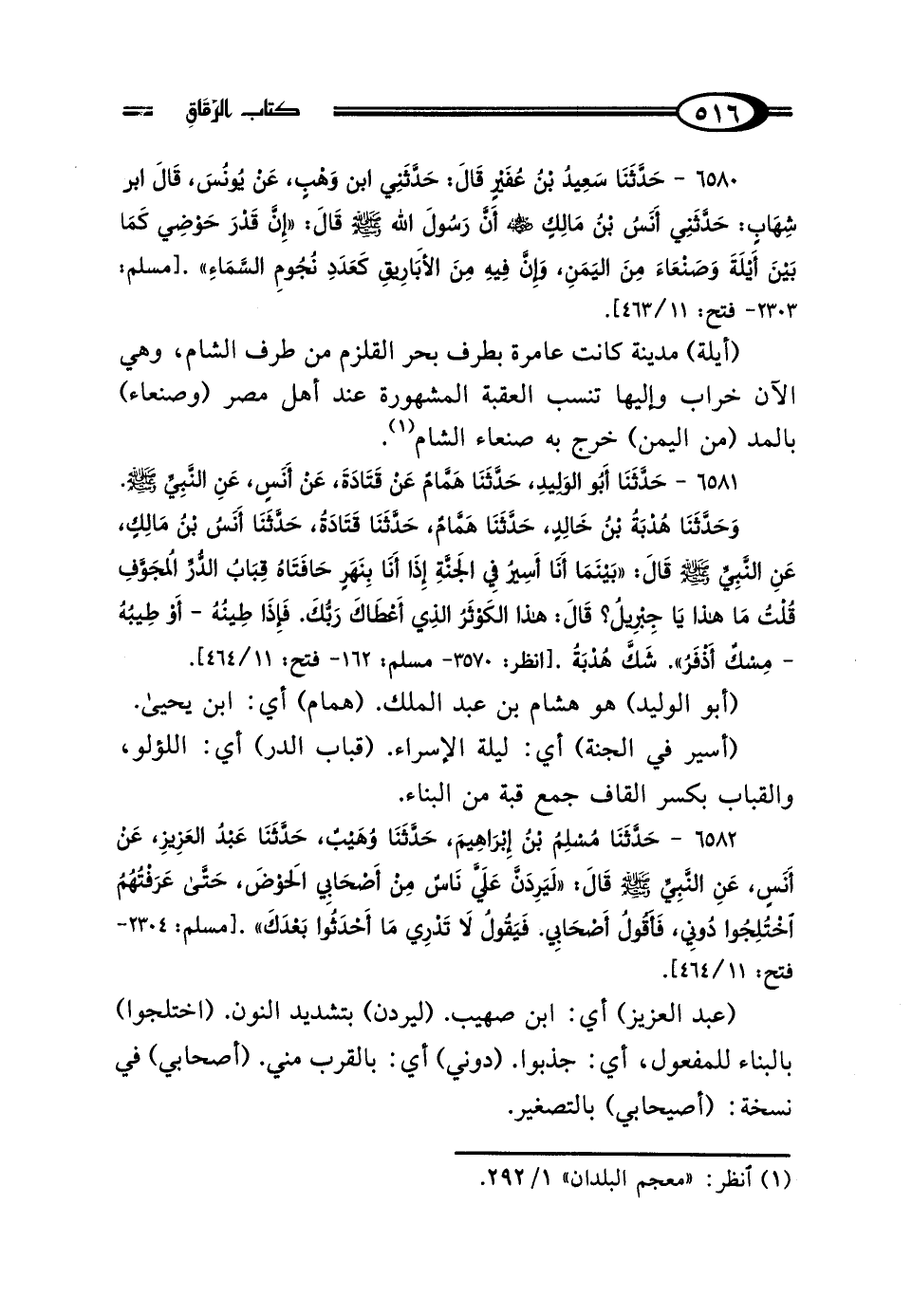 6580 - حَدَّثَنَا سَعِيدُ بْنُ عُفَيْرٍ، قَال: حَدَّثَنِي ابْنُ وَهْبٍ، عَنْ يُونُسَ، قَال ابْنُ شِهَابٍ: حَدَّثَنِي أَنَسُ بْنُ مَالِكٍ رَضِيَ اللَّهُ عَنْهُ: أَنَّ رَسُولَ اللَّهِ صَلَّى اللهُ عَلَيْهِ وَسَلَّمَ قَال: "إِنَّ قَدْرَ حَوْضِي كَمَا بَيْنَ أَيْلَةَ وَصَنْعَاءَ مِنَ اليَمَنِ، وَإِنَّ فِيهِ مِنَ الأَبَارِيقِ كَعَدَدِ نُجُومِ السَّمَاءِ".