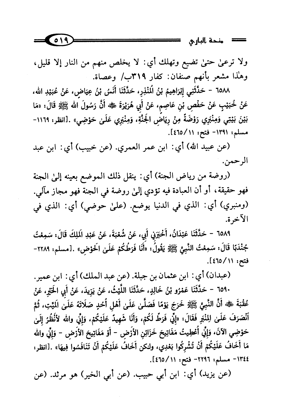 6588 - حَدَّثَنِي إِبْرَاهِيمُ بْنُ المُنْذِرِ، حَدَّثَنَا أَنَسُ بْنُ عِيَاضٍ، عَنْ عُبَيْدِ اللَّهِ، عَنْ خُبَيْبِ بْنِ عَبْدِ الرَّحْمَنِ، عَنْ حَفْصِ بْنِ عَاصِمٍ، عَنْ أَبِي هُرَيْرَةَ رَضِيَ اللَّهُ عَنْهُ: أَنَّ رَسُولَ اللَّهِ صَلَّى اللهُ عَلَيْهِ وَسَلَّمَ قَال: "مَا بَيْنَ بَيْتِي وَمِنْبَرِي رَوْضَةٌ مِنْ رِيَاضِ الجَنَّةِ، وَمِنْبَرِي عَلَى حَوْضِي".