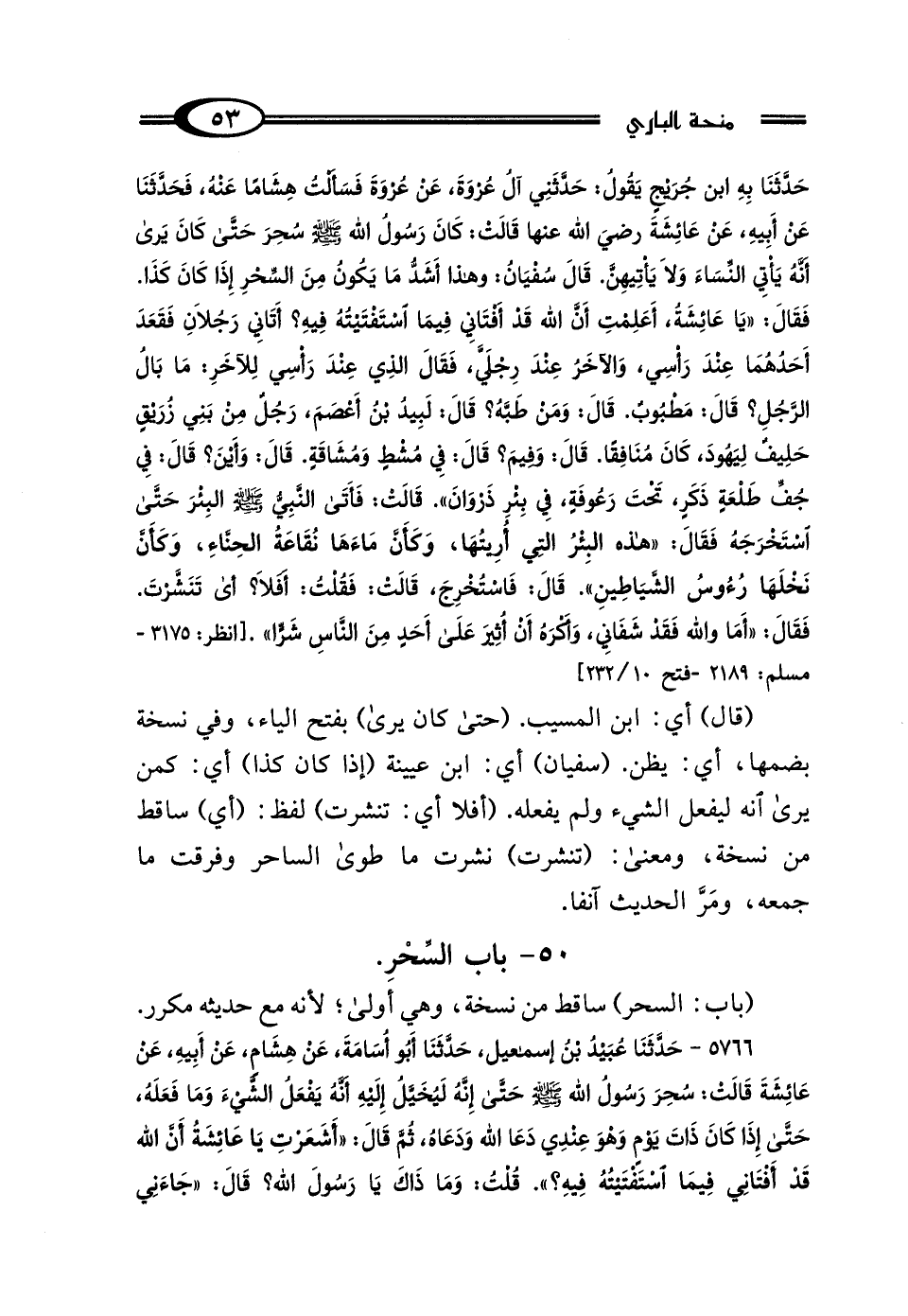 حَدَّثَنَا بِهِ ابْنُ جُرَيْجٍ، يَقُولُ: حَدَّثَنِي آلُ عُرْوَةَ، عَنْ عُرْوَةَ، فَسَأَلْتُ هِشَامًا، عَنْهُ، فَحَدَّثَنَا عَنْ أَبِيهِ، عَنْ عَائِشَةَ، رَضِيَ اللَّهُ عَنْهَا قَالتْ: كَانَ رَسُولُ اللَّهِ صَلَّى اللهُ عَلَيْهِ وَسَلَّمَ سُحِرَ، حَتَّى كَانَ يَرَى أَنَّهُ يَأْتِي النِّسَاءَ وَلَا يَأْتِيهِنَّ، قَال سُفْيَانُ: وَهَذَا أَشَدُّ مَا يَكُونُ مِنَ السِّحْرِ، إِذَا كَانَ كَذَا، فَقَال: "يَا عَائِشَةُ، أَعَلِمْتِ أَنَّ اللَّهَ قَدْ أَفْتَانِي فِيمَا اسْتَفْتَيْتُهُ فِيهِ، أَتَانِي رَجُلانِ، فَقَعَدَ أَحَدُهُمَا عِنْدَ رَأْسِي، وَالآخَرُ عِنْدَ رِجْلَيَّ، فَقَال الَّذِي عِنْدَ رَأْسِي لِلْآخَرِ: مَا بَالُ الرَّجُلِ؟ قَال: مَطْبُوبٌ، قَال: وَمَنْ طَبَّهُ؟ قَال: لَبِيدُ بْنُ أَعْصَمَ - رَجُلٌ مِنْ بَنِي زُرَيْقٍ حَلِيفٌ لِيَهُودَ كَانَ مُنَافِقًا - قَال: وَفِيمَ؟ قَال: فِي مُشْطٍ وَمُشَاقَةٍ، قَال: وَأَيْنَ؟ قَال: فِي جُفِّ طَلْعَةٍ ذَكَرٍ، تَحْتَ رَاعُوفَةٍ فِي بِئْرِ ذَرْوَانَ " قَالتْ: فَأَتَى النَّبِيُّ صَلَّى اللهُ عَلَيْهِ وَسَلَّمَ البِئْرَ حَتَّى اسْتَخْرَجَهُ، فَقَال: "هَذِهِ البِئْرُ الَّتِي أُرِيتُهَا، وَكَأَنَّ مَاءَهَا نُقَاعَةُ الحِنَّاءِ، وَكَأَنَّ نَخْلَهَا رُءُوسُ الشَّيَاطِينِ" قَال: فَاسْتُخْرِجَ، قَالتْ: فَقُلْتُ: أَفَلا؟ - أَيْ تَنَشَّرْتَ - فَقَال: "أَمَّا اللَّهُ فَقَدْ شَفَانِي، وَأَكْرَهُ أَنْ أُثِيرَ عَلَى أَحَدٍ مِنَ النَّاسِ شَرًّا".