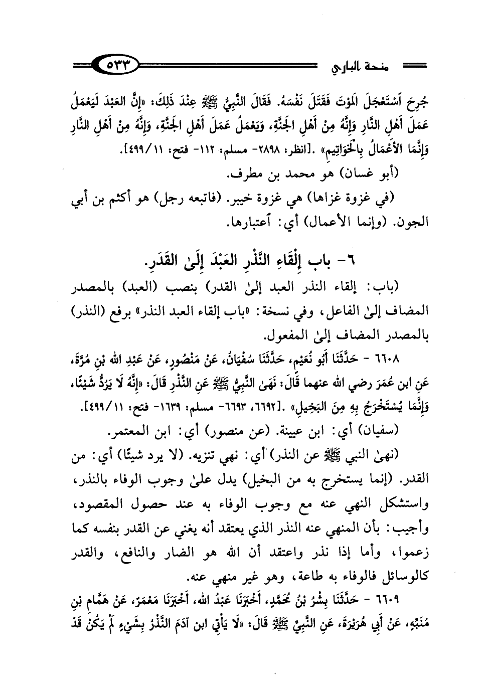 6608 - حَدَّثَنَا أَبُو نُعَيْمٍ، حَدَّثَنَا سُفْيَانُ، عَنْ مَنْصُورٍ، عَنْ عَبْدِ اللَّهِ بْنِ مُرَّةَ، عَنِ ابْنِ عُمَرَ رَضِيَ اللَّهُ عَنْهُمَا، قَال: نَهَى النَّبِيُّ صَلَّى اللهُ عَلَيْهِ وَسَلَّمَ عَنِ النَّذْرِ، وَقَال: "إِنَّهُ لَا يَرُدُّ شَيْئًا، وَإِنَّمَا يُسْتَخْرَجُ بِهِ مِنَ البَخِيلِ".