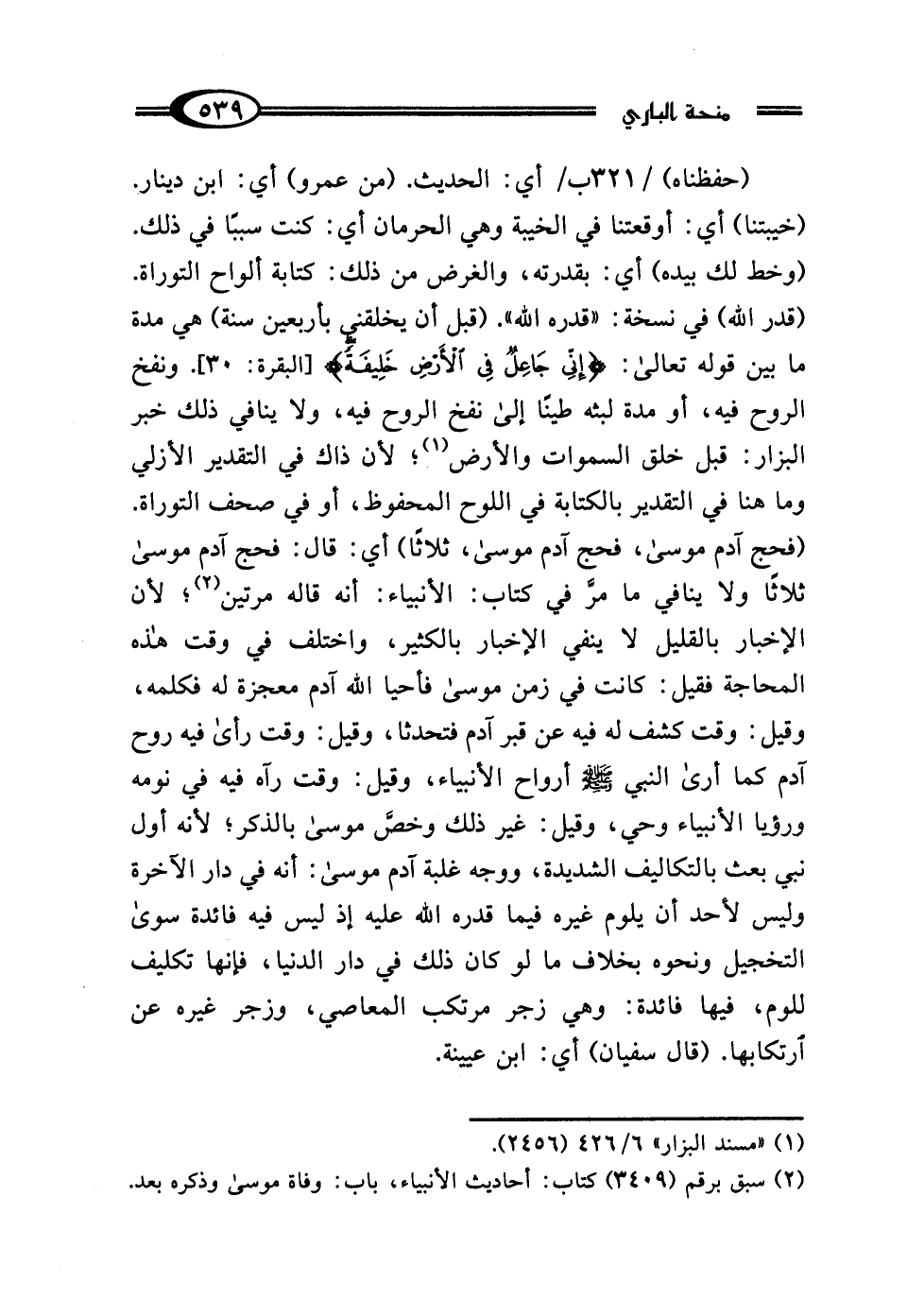 (خيبتنا) أي: أوقعتنا في الخيبة وهي الحرمان أي: كنت سببًا في ذلك. (وخط لك بيده) أي: بقدرته، والغرض من ذلك: كتابة ألواح التوراة. (قدر اللَّه) في نسخة: "قدره اللَّه". (قبل أن يخلقني بأربعين سنة) هي مدة ما بين قوله تعالى: {إِنِّي جَاعِلٌ فِي الْأَرْضِ خَلِيفَةً} [البقرة: 30]. ونفخ الروح فيه، أو مدة لبثه طينًا إلى نفخ الروح فيه، ولا ينافي ذلك خبر البزار: قبل خلق السموات والأرض (¬1)؛ لأن ذاك في التقدير الأزلي وما هنا في التقدير بالكتابة في اللوح المحفوظ، أو في صحف التوراة. (فحج آدم موسى، فحج آدم موسى، ثلاثًا) أي: قال: فحج آدم موسى ثلاثًا ولا ينافي ما مرَّ في كتاب: الأنبياء: أنه قاله مرتين (¬2)؛ لأن الإخبار بالقليل لا ينفي الإخبار بالكثير، واختلف في وقت هذه المحاجة فقيل: كانت في زمن موسى فأحيا اللَّه آدم معجزة له فكلمه، وقيل: وقت كشف له فيه عن قبر آدم فتحدثا، وقيل: وقت رأى فيه روح آدم كما أرى النبي - صلى الله عليه وسلم - أرواح الأنبياء، وقيل: وقت رآه فيه في نومه ورؤيا الأنبياء وحي، وقيل: غير ذلك وخصَّ موسى بالذكر؛ لأنه أول نبي بعث بالتكاليف الشديدة، ووجه غلبة آدم موسى: أنه في دار الآخرة وليس لأحد أن يلوم غيره فيما قدره اللَّه عليه إذ ليس فيه فائدة سوى التخجيل ونحوه بخلاف ما لو كان ذلك في دار الدنيا، فإنها تكليف للوم، فيها فائدة: وهي زجر مرتكب المعاصي، وزجر غيره عن ارتكابها. (قال سفيان) أي: ابن عيينة.