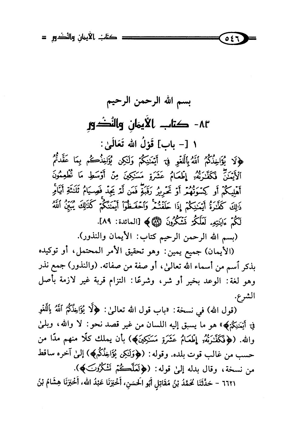 1 - [باب] قَوْلُ اللَّه تَعَالى: {لَا يُؤَاخِذُكُمُ اللَّهُ بِاللَّغْو فِي أَيْمَانِكُمْ وَلَكِنْ يُؤَاخِذُكُمْ بِمَا عَقَّدْتُمُ الْأَيْمَانَ فَكَفَّارَتُهُ إِطْعَامُ عَشَرَةِ مَسَاكِينَ مِنْ أَوْسَطِ مَا تُطْعِمُونَ أَهْلِيكُمْ أَوْ كِسْوَتُهُمْ أَوْ تَحْرِيرُ رَقَبَةٍ فَمَنْ لَمْ يَجِدْ فَصِيَامُ ثَلَاثَةِ أَيَّامٍ ذَلِكَ كَفَّارَةُ أَيْمَانِكُمْ إِذَا حَلَفْتُمْ وَاحْفَظُوا أَيْمَانَكُمْ كَذَلِكَ يُبَيِّنُ اللَّهُ لَكُمْ آيَاتِهِ لَعَلَّكُمْ تَشْكُرُونَ (89)} [المائدة: 89].