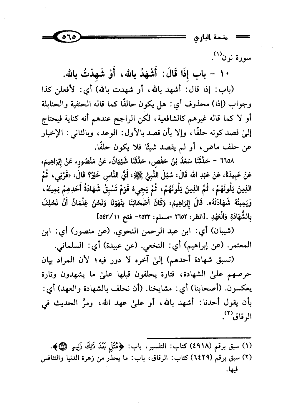 6658 - حَدَّثَنَا سَعْدُ بْنُ حَفْصٍ، حَدَّثَنَا شَيْبَانُ، عَنْ مَنْصُورٍ، عَنْ إِبْرَاهِيمَ، عَنْ عَبِيدَةَ، عَنْ عَبْدِ اللَّهِ، قَال: سُئِلَ النَّبِيُّ صَلَّى اللهُ عَلَيْهِ وَسَلَّمَ أَيُّ النَّاسِ خَيْرٌ؟ قَال: "قَرْنِي، ثُمَّ الَّذِينَ يَلُونَهُمْ، ثُمَّ الَّذِينَ يَلُونَهُمْ، ثُمَّ يَجِيءُ قَوْمٌ: تَسْبِقُ شَهَادَةُ أَحَدِهِمْ يَمِينَهُ وَيَمِينُهُ شَهَادَتَهُ " قَال إِبْرَاهِيمُ: "وَكَانَ أَصْحَابُنَا يَنْهَوْنَا - وَنَحْنُ غِلْمَانٌ - أَنْ نَحْلِفَ بِالشَّهَادَةِ وَالعَهْدِ".