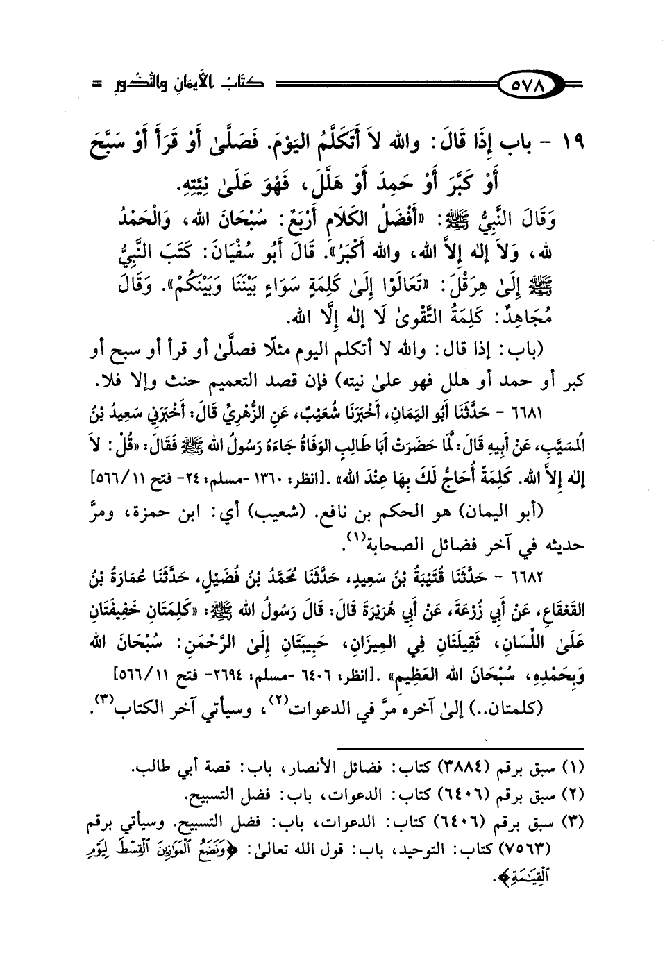 وَقَال النَّبِيُّ صَلَّى اللهُ عَلَيْهِ وَسَلَّمَ: "أَفْضَلُ الكَلامِ أَرْبَعٌ: سُبْحَانَ اللَّهِ، وَالحَمْدُ لِلَّهِ، وَلَا إِلَهَ إلا اللَّهُ وَاللَّهُ أَكْبَرُ " قَال أَبُو سُفْيَانَ: كَتَبَ النَّبِيُّ صَلَّى اللهُ عَلَيْهِ وَسَلَّمَ إِلَى هِرَقْلَ: {تَعَالوْا إِلَى كَلِمَةٍ سَوَاءٍ بَيْنَنَا وَبَيْنَكُمْ} [آل عمران: 64] وَقَال مُجَاهِدٌ: {كَلِمَةُ التَّقْوَى} [الفتح: 26]: "لَا إِلَهَ إلا اللَّهُ".