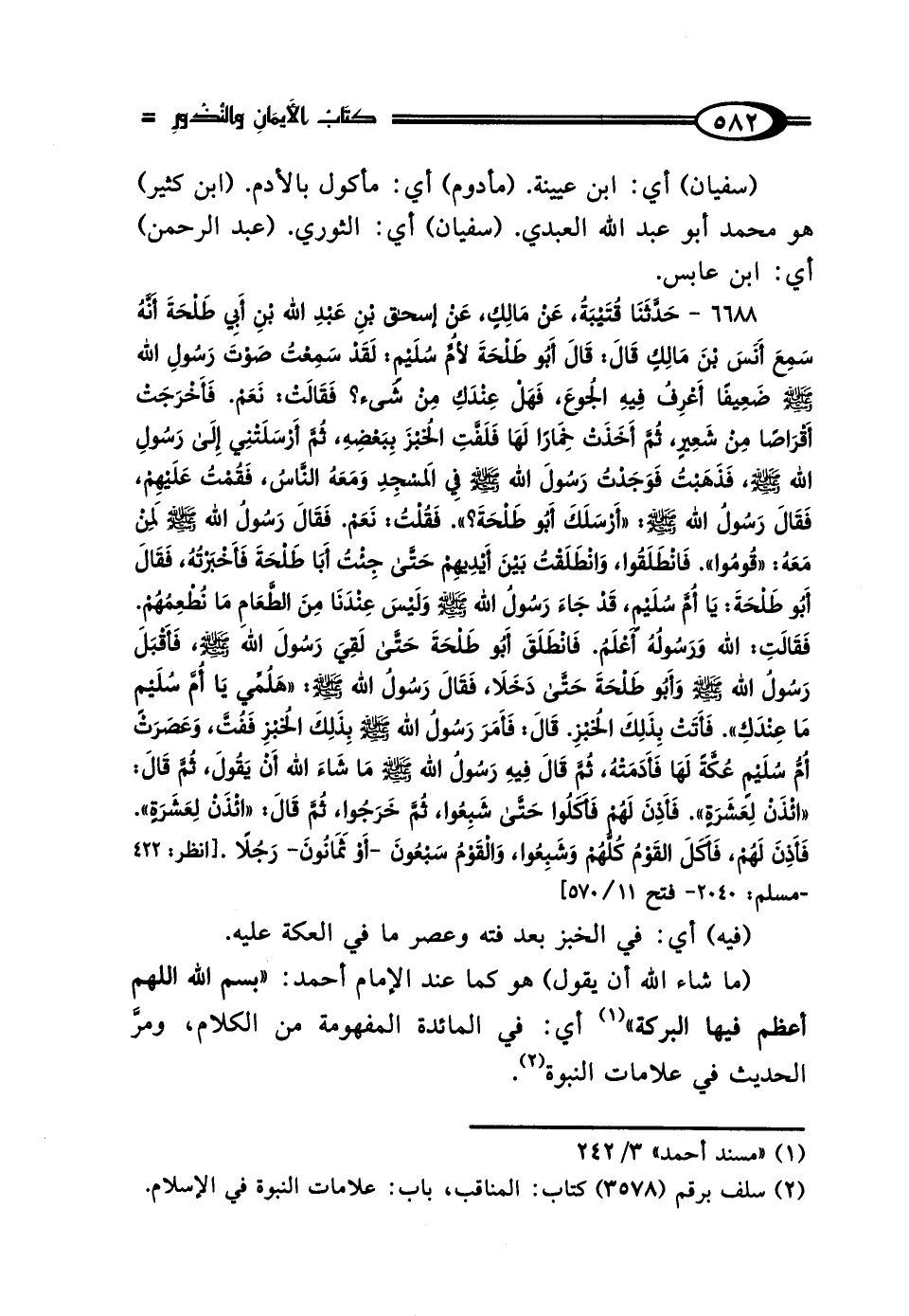 6688 - حَدَّثَنَا قُتَيْبَةُ، عَنْ مَالِكٍ، عَنْ إِسْحَاقَ بْنِ عَبْدِ اللَّهِ بْنِ أَبِي طَلْحَةَ، أَنَّهُ سَمِعَ أَنَسَ بْنَ مَالِكٍ، قَال: قَال أَبُو طَلْحَةَ لِأُمِّ سُلَيْمٍ لَقَدْ: سَمِعْتُ صَوْتَ رَسُولِ اللَّهِ صَلَّى اللهُ عَلَيْهِ وَسَلَّمَ ضَعِيفًا، أَعْرِفُ فِيهِ الجُوعَ، فَهَلْ عِنْدَكِ مِنْ شَيْءٍ؟ فَقَالتْ: نَعَمْ، فَأَخْرَجَتْ أَقْرَاصًا مِنْ شَعِيرٍ، ثُمَّ أَخَذَتْ خِمَارًا لَهَا، فَلَفَّتِ الخُبْزَ بِبَعْضِهِ، ثُمَّ أَرْسَلَتْنِي إِلَى رَسُولِ اللَّهِ صَلَّى اللهُ عَلَيْهِ وَسَلَّمَ، فَذَهَبْتُ فَوَجَدْتُ رَسُولَ اللَّهِ صَلَّى اللهُ عَلَيْهِ وَسَلَّمَ فِي المَسْجِدِ وَمَعَهُ النَّاسُ، فَقُمْتُ عَلَيْهِمْ، فَقَال رَسُولُ اللَّهِ صَلَّى اللهُ عَلَيْهِ وَسَلَّمَ: "أَرْسَلَكَ أَبُو طَلْحَةَ" فَقُلْتُ: نَعَمْ، فَقَال رَسُولُ اللَّهِ صَلَّى اللهُ عَلَيْهِ وَسَلَّمَ لِمَنْ مَعَهُ: "قُومُوا" فَانْطَلَقُوا وَانْطَلَقْتُ بَيْنَ أَيْدِيهِمْ، حَتَّى جِئْتُ أَبَا طَلْحَةَ فَأَخْبَرْتُهُ، فَقَال أَبُو طَلْحَةَ: يَا أُمَّ سُلَيْمٍ، قَدْ جَاءَ رَسُولُ اللَّهِ صَلَّى اللهُ عَلَيْهِ وَسَلَّمَ وَالنَّاسُ، وَلَيْسَ عِنْدَنَا مِنَ الطَّعَامِ مَا نُطْعِمُهُمْ، فَقَالتْ: اللَّهُ وَرَسُولُهُ أَعْلَمُ، فَانْطَلَقَ أَبُو طَلْحَةَ حَتَّى لَقِيَ رَسُولَ اللَّهِ صَلَّى اللهُ عَلَيْهِ وَسَلَّمَ، فَأَقْبَلَ رَسُولُ اللَّهِ صَلَّى اللهُ عَلَيْهِ وَسَلَّمَ وَأَبُو طَلْحَةَ حَتَّى دَخَلا، فَقَال رَسُولُ اللَّهِ صَلَّى اللهُ عَلَيْهِ وَسَلَّمَ: "هَلُمِّي يَا أُمَّ سُلَيْمٍ مَا عِنْدَكِ" فَأَتَتْ بِذَلِكَ الخُبْزِ، قَال: فَأَمَرَ رَسُولُ اللَّهِ صَلَّى اللهُ عَلَيْهِ وَسَلَّمَ بِذَلِكَ الخُبْزِ فَفُتَّ، وَعَصَرَتْ أُمُّ سُلَيْمٍ عُكَّةً لَهَا فَأَدَمَتْهُ، ثُمَّ قَال فِيهِ رَسُولُ اللَّهِ صَلَّى اللهُ عَلَيْهِ وَسَلَّمَ مَا شَاءَ اللَّهُ أَنْ يَقُولَ، ثُمَّ قَال: "ائْذَنْ لِعَشَرَةٍ" فَأَذِنَ لَهُمْ فَأَكَلُوا حَتَّى شَبِعُوا، ثُمَّ خَرَجُوا، ثُمَّ قَال: "ائْذَنْ لِعَشَرَةٍ" فَأَذِنَ لَهُمْ، فَأَكَلُوا حَتَّى شَبِعُوا، ثُمَّ خَرَجُوا، ثُمَّ قَال: "ائْذَنْ لِعَشَرَةٍ" فَأَكَلَ القَوْمُ كُلُّهُمْ وَشَبِعُوا، وَالقَوْمُ سَبْعُونَ أَوْ ثَمَانُونَ رَجُلًا.