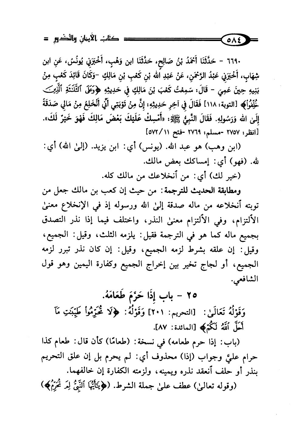 6690 - حَدَّثَنَا أَحْمَدُ بْنُ صَالِحٍ، حَدَّثَنَا ابْنُ وَهْبٍ، أَخْبَرَنِي يُونُسُ، عَنِ ابْنِ شِهَابٍ، أَخْبَرَنِي عَبْدُ الرَّحْمَنِ بْنُ عَبْدِ اللَّهِ بْنِ كَعْبِ بْنِ مَالِكٍ، عَنْ عَبْدِ اللَّهِ بْنِ كَعْبٍ، وَكَانَ قَائِدَ كَعْبٍ مِنْ بَنِيهِ حِينَ عَمِيَ، قَال: سَمِعْتُ كَعْبَ بْنَ مَالِكٍ، فِي حَدِيثِهِ: {وَعَلَى الثَّلاثَةِ الَّذِينَ خُلِّفُوا} [التوبة: 118] فَقَال فِي آخِرِ حَدِيثِهِ: إِنَّ مِنْ تَوْبَتِي أَنِّي أَنْخَلِعُ مِنْ مَالِي صَدَقَةً إِلَى اللَّهِ وَرَسُولِهِ، فَقَال النَّبِيُّ صَلَّى اللهُ عَلَيْهِ وَسَلَّمَ: "أَمْسِكْ عَلَيْكَ بَعْضَ مَالِكَ، فَهُوَ خَيْرٌ لَكَ".