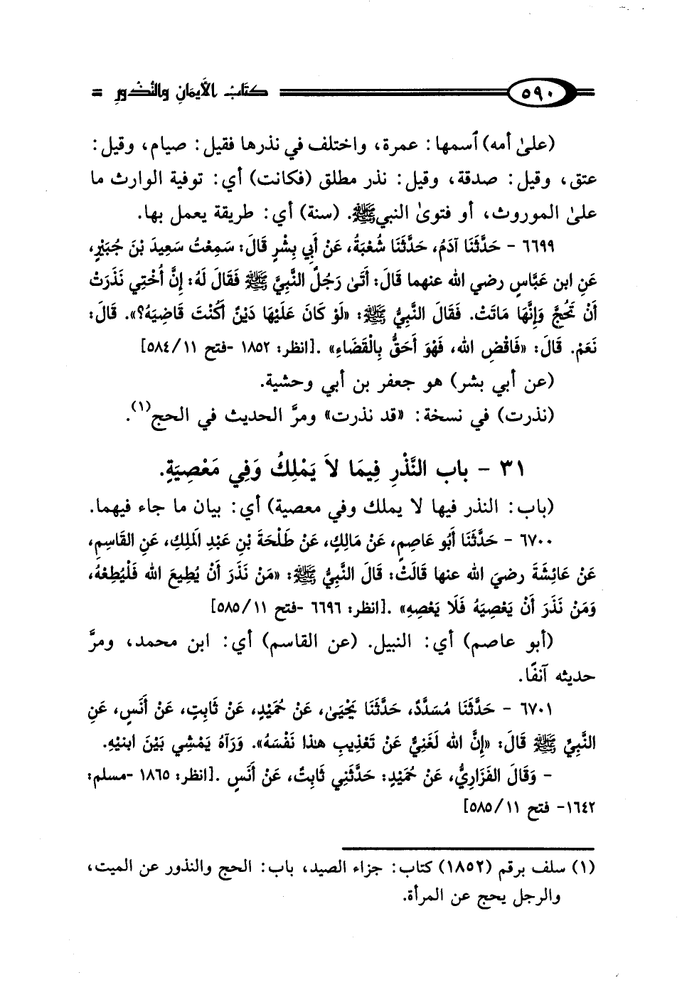 31 - بَابُ النَّذْرِ فِيمَا لَا يَمْلِكُ وَفِي مَعْصِيَةٍ