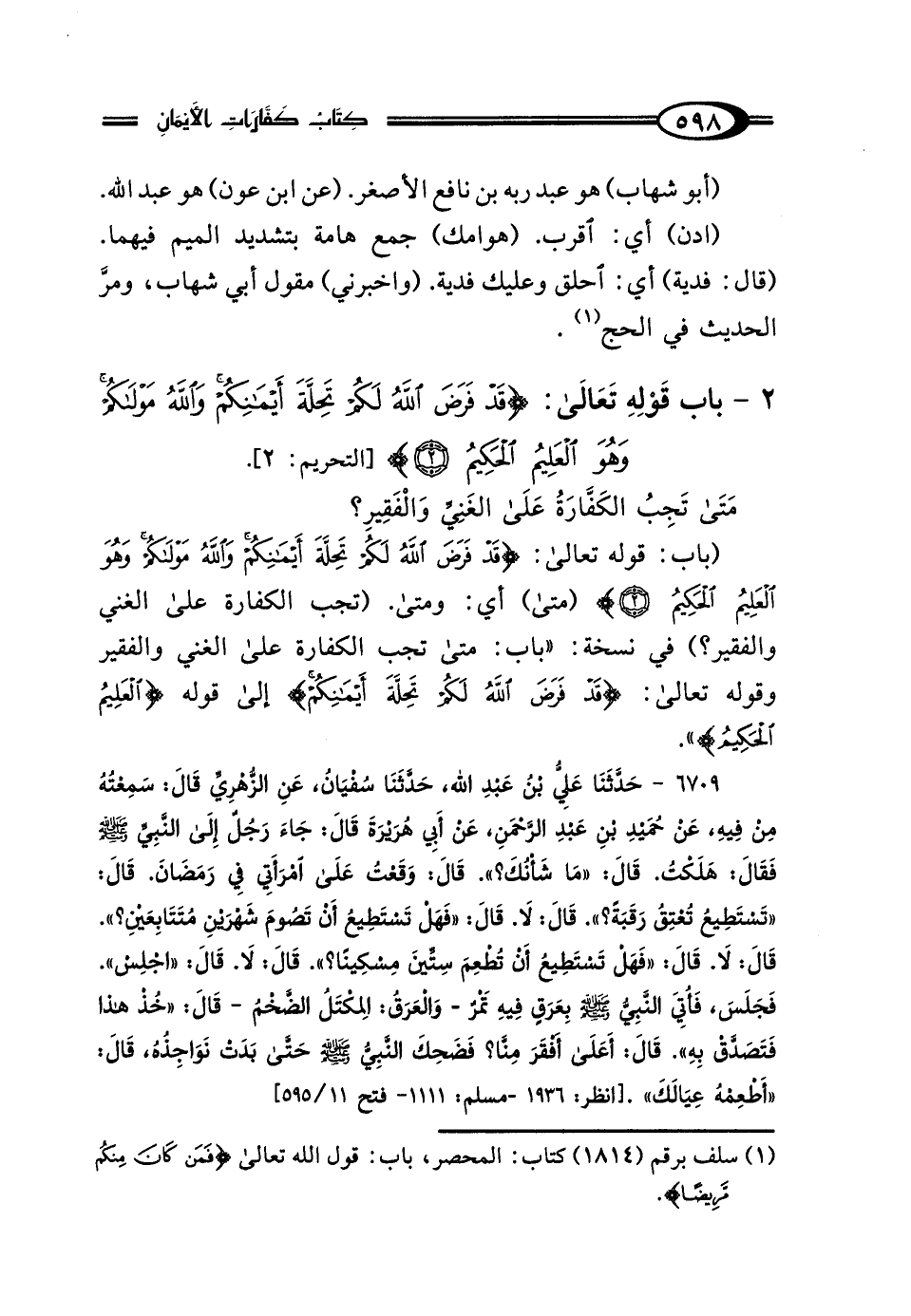 (باب: قوله تعالى: {قَدْ فَرَضَ اللَّهُ لَكُمْ تَحِلَّةَ أَيْمَانِكُمْ وَاللَّهُ مَوْلَاكُمْ وَهُوَ الْعَلِيمُ الْحَكِيمُ (2)} (متى) أي: ومتى. (تجب الكفارة على الغني والفقير؟) في نسخة: "باب: متى تجب الكفارة على الغني والفقير وقوله تعالى: {قَدْ فَرَضَ اللَّهُ لَكُمْ تَحِلَّةَ أَيْمَانِكُمْ} إلى قوله {الْعَلِيمُ الْحَكِيمُ} ".