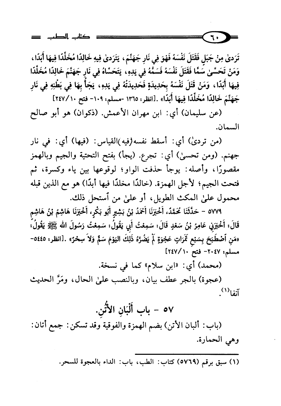 5779 - حَدَّثَنَا مُحَمَّدُ بْنُ سَلامٍ، حَدَّثَنَا أَحْمَدُ بْنُ بَشِيرٍ أَبُو بَكْرٍ، أَخْبَرَنَا هَاشِمُ بْنُ هَاشِمٍ، قَال: أَخْبَرَنِي عَامِرُ بْنُ سَعْدٍ، قَال: سَمِعْتُ أَبِي، يَقُولُ: سَمِعْتُ رَسُولَ اللَّهِ صَلَّى اللهُ عَلَيْهِ وَسَلَّمَ يَقُولُ: "مَنِ اصْطَبَحَ بِسَبْعِ تَمَرَاتِ عَجْوَةٍ، لَمْ يَضُرَّهُ ذَلِكَ اليَوْمَ سَمٌّ، وَلَا سِحْرٌ".