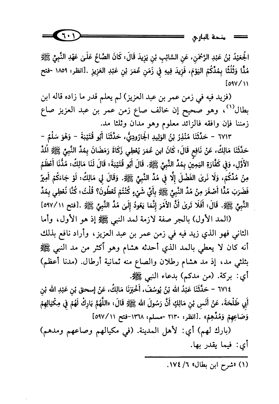 6713 - حَدَّثَنَا مُنْذِرُ بْنُ الوَلِيدِ الجَارُودِيُّ، حَدَّثَنَا أَبُو قُتَيْبَةَ وَهْوَ سَلْمٌ، حَدَّثَنَا مَالِكٌ، عَنْ نَافِعٍ، قَال: "كَانَ ابْنُ عُمَرَ، يُعْطِي زَكَاةَ رَمَضَانَ بِمُدِّ النَّبِيِّ صَلَّى اللهُ عَلَيْهِ وَسَلَّمَ المُدِّ الأَوَّلِ، وَفِي كَفَّارَةِ اليَمِينِ بِمُدِّ النَّبِيِّ صَلَّى اللهُ عَلَيْهِ وَسَلَّمَ" قَال أَبُوقُتَيْبَةَ: قَال لَنَا مَالِكٌ: "مُدُّنَا أَعْظَمُ مِنْ مُدِّكُمْ، وَلَا نَرَى الفَضْلَ إلا فِي مُدِّ النَّبِيِّ صَلَّى اللهُ عَلَيْهِ وَسَلَّمَ" وَقَال لِي مَالِكٌ: لَوْ جَاءَكُمْ أَمِيرٌ فَضَرَبَ مُدًّا أَصْغَرَ مِنْ مُدِّ النَّبِيِّ صَلَّى اللهُ عَلَيْهِ وَسَلَّمَ، بِأَيِّ شَيْءٍ كُنْتُمْ تُعْطُونَ؟ قُلْتُ: كُنَّا نُعْطِي بِمُدِّ النَّبِيِّ صَلَّى اللهُ عَلَيْهِ وَسَلَّمَ، قَال: أَفَلا تَرَى أَنَّ الأَمْرَ إِنَّمَا يَعُودُ إِلَى مُدِّ النَّبِيِّ صَلَّى اللهُ عَلَيْهِ وَسَلَّمَ.
