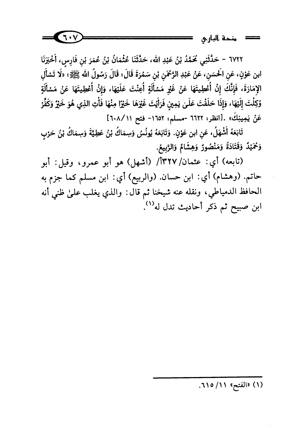 6722 - حَدَّثَنَا مُحَمَّدُ بْنُ عَبْدِ اللَّهِ، حَدَّثَنَا عُثْمَانُ بْنُ عُمَرَ بْنِ فَارِسٍ، أَخْبَرَنَا ابْنُ عَوْنٍ، عَنِ الحَسَنِ، عَنْ عَبْدِ الرَّحْمَنِ بْنِ سَمُرَةَ، قَال: قَال رَسُولُ اللَّهِ صَلَّى اللهُ عَلَيْهِ وَسَلَّمَ: "لَا تَسْأَلِ الإِمَارَةَ، فَإِنَّكَ إِنْ أُعْطِيتَهَا مِنْ غَيْرِ مَسْأَلَةٍ أُعِنْتَ عَلَيْهَا، وَإِنْ أُعْطِيتَهَا عَنْ مَسْأَلَةٍ وُكِلْتَ إِلَيْهَا، وَإِذَا حَلَفْتَ عَلَى يَمِينٍ، فَرَأَيْتَ غَيْرَهَا خَيْرًا مِنْهَا، فَأْتِ الَّذِي هُوَ خَيْرٌ، وَكَفِّرْ عَنْ يَمِينِكَ" [انظر: 6622 - مسلم 1652 - فتح 11/ 608]