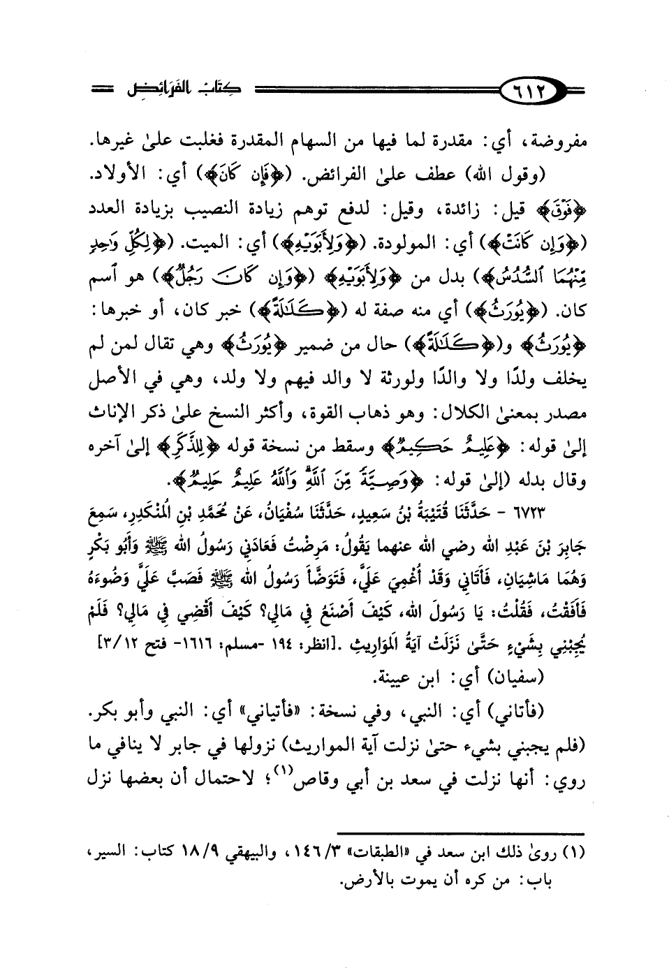 (فأتاني) أي: النبي، وفي نسخة: "فأتياني" أي: النبي وأبو بكر. (فلم يجبني بشيء حتى نزلت آية المواريث) نزولها في جابر لا ينافي ما روي: أنها نزلت في سعد بن أبي وقاص (¬1)؛ لاحتمال أن بعضها نزل