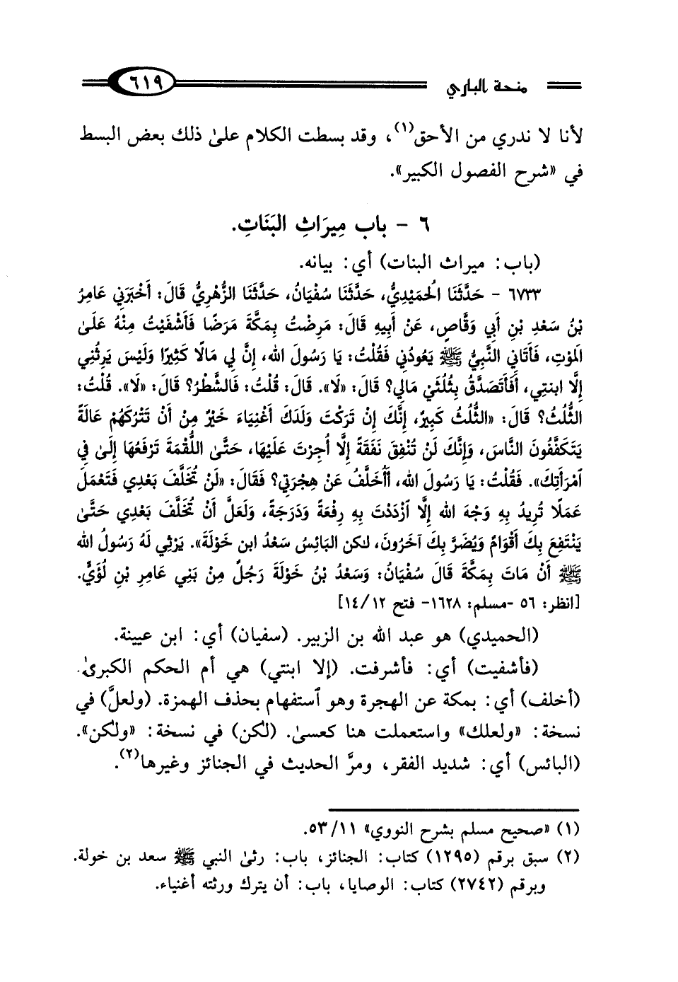 6733 - حَدَّثَنَا الحُمَيْدِيُّ، حَدَّثَنَا سُفْيَانُ، حَدَّثَنَا الزُّهْرِيُّ، قَال: أَخْبَرَنِي عَامِرُ بْنُ سَعْدِ بْنِ أَبِي وَقَّاصٍ، عَنْ أَبِيهِ، قَال: مَرِضْتُ بِمَكَّةَ مَرَضًا، فَأَشْفَيْتُ مِنْهُ عَلَى المَوْتِ، فَأَتَانِي النَّبِيُّ صَلَّى اللهُ عَلَيْهِ وَسَلَّمَ يَعُودُنِي، فَقُلْتُ: يَا رَسُولَ اللَّهِ، إِنَّ لِي مَالًا كَثِيرًا، وَلَيْسَ يَرِثُنِي إلا ابْنَتِي، أَفَأَتَصَدَّقُ بِثُلُثَيْ مَالِي؟ قَال: "لَا" قَال: قُلْتُ: فَالشَّطْرُ؟ قَال: "لَا" قُلْتُ: الثُّلُثُ؟ قَال: "الثُّلُثُ كَبِيرٌ، إِنَّكَ إِنْ تَرَكْتَ وَلَدَكَ أَغْنِيَاءَ خَيْرٌ مِنْ أَنْ تَتْرُكَهُمْ عَالةً يَتَكَفَّفُونَ النَّاسَ، وَإِنَّكَ لَنْ تُنْفِقَ نَفَقَةً إلا أُجِرْتَ عَلَيْهَا، حَتَّى اللُّقْمَةَ تَرْفَعُهَا إِلَى فِي امْرَأَتِكَ" فَقُلْتُ: يَا رَسُولَ اللَّهِ، آأُخَلَّفُ عَنْ هِجْرَتِي؟ فَقَال: "لَنْ تُخَلَّفَ بَعْدِي، فَتَعْمَلَ عَمَلًا تُرِيدُ بِهِ وَجْهَ اللَّهِ، إلا ازْدَدْتَ بِهِ رِفْعَةً وَدَرَجَةً، وَلَعَلَّ أَنْ تُخَلَّفَ بَعْدِي حَتَّى يَنْتَفِعَ بِكَ أَقْوَامٌ وَيُضَرَّ بِكَ آخَرُونَ، لَكِنِ البَائِسُ سَعْدُ ابْنُ خَوْلَةَ" يَرْثِي لَهُ رَسُولُ اللَّهِ صَلَّى اللهُ عَلَيْهِ وَسَلَّمَ أَنْ مَاتَ بِمَكَّةَ، قَال سُفْيَانُ: "وَسَعْدُ ابْنُ خَوْلَةَ رَجُلٌ مِنْ بَنِي عَامِرِ بْنِ لُؤَيٍّ".