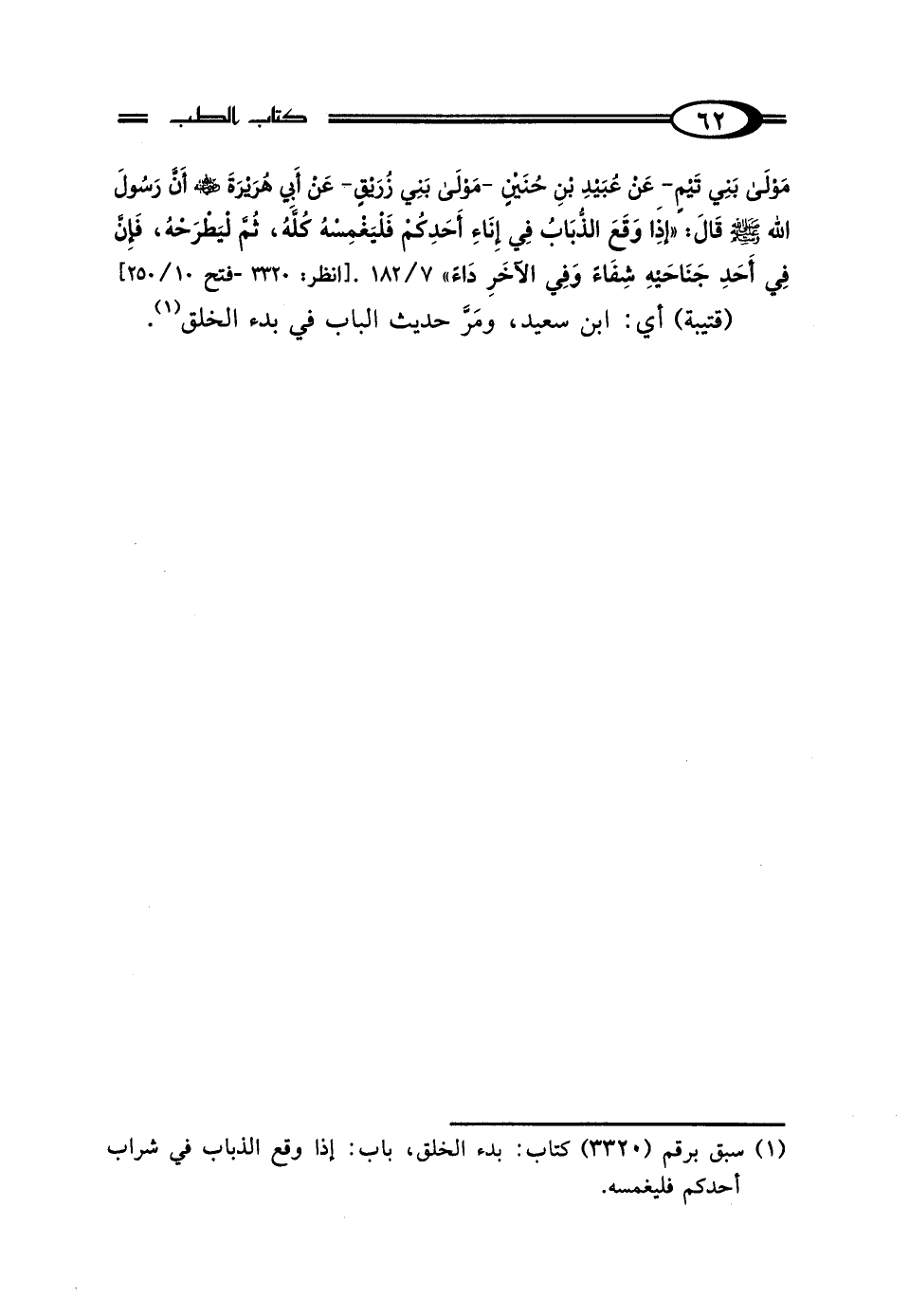مَوْلَى بَنِي تَيْمٍ، عَنْ عُبَيْدِ بْنِ حُنَيْنٍ، مَوْلَى بَنِي زُرَيْقٍ، عَنْ أَبِي هُرَيْرَةَ رَضِيَ اللَّهُ عَنْهُ أَنَّ رَسُولَ اللَّهِ صَلَّى اللهُ عَلَيْهِ وَسَلَّمَ قَال: "إِذَا وَقَعَ الذُّبَابُ فِي إِنَاءِ أَحَدِكُمْ فَلْيَغْمِسْهُ كُلَّهُ، ثُمَّ لِيَطْرَحْهُ، فَإِنَّ فِي أَحَدِ جَنَاحَيْهِ شِفَاءً، وَفِي الآخَرِ دَاءً".