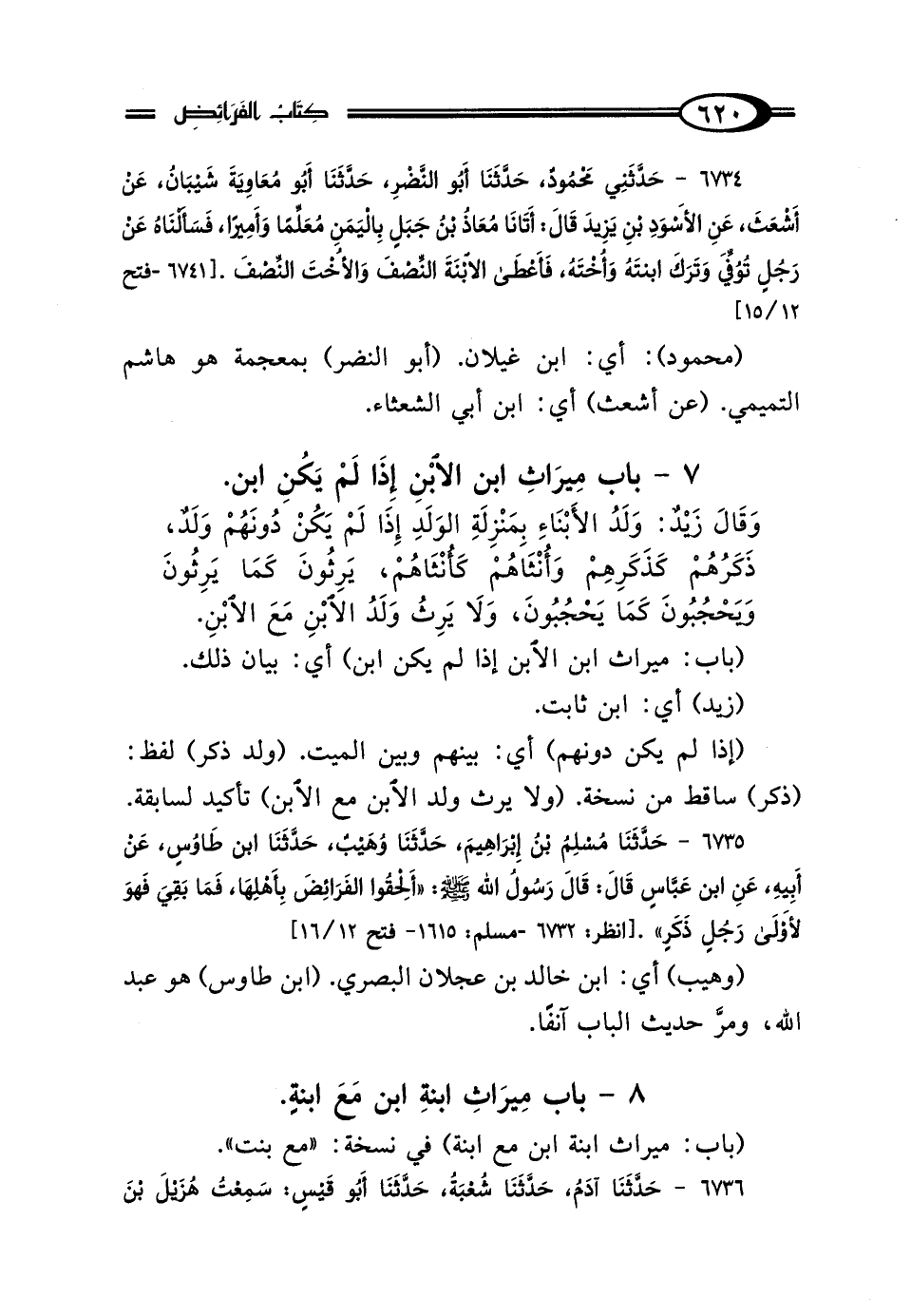 6735 - حَدَّثَنَا مُسْلِمُ بْنُ إِبْرَاهِيمَ، حَدَّثَنَا وُهَيْبٌ، حَدَّثَنَا ابْنُ طَاوُسٍ، عَنْ أَبِيهِ، عَنِ ابْنِ عَبَّاسٍ، قَال: قَال رَسُولُ اللَّهِ صَلَّى اللهُ عَلَيْهِ وَسَلَّمَ: "أَلْحِقُوا الفَرَائِضَ بِأَهْلِهَا، فَمَا بَقِيَ فَهُوَ لِأَوْلَى رَجُلٍ ذَكَرٍ".